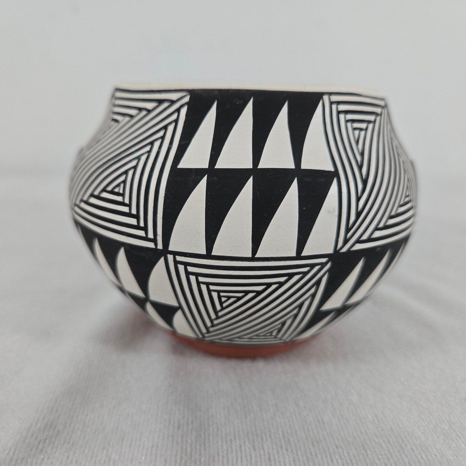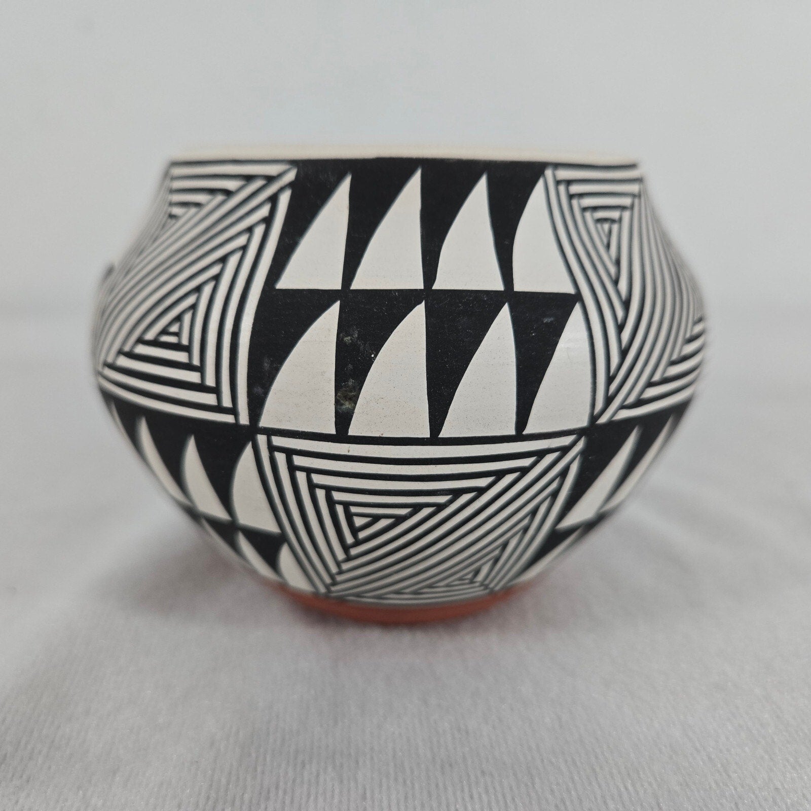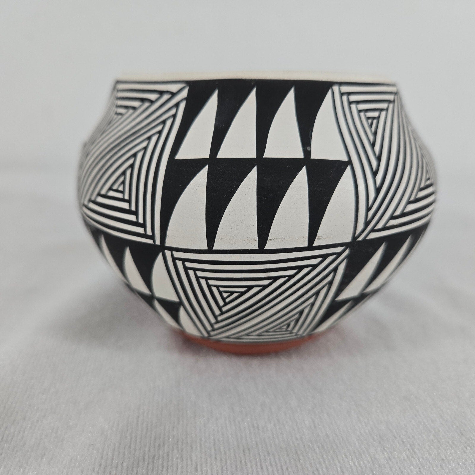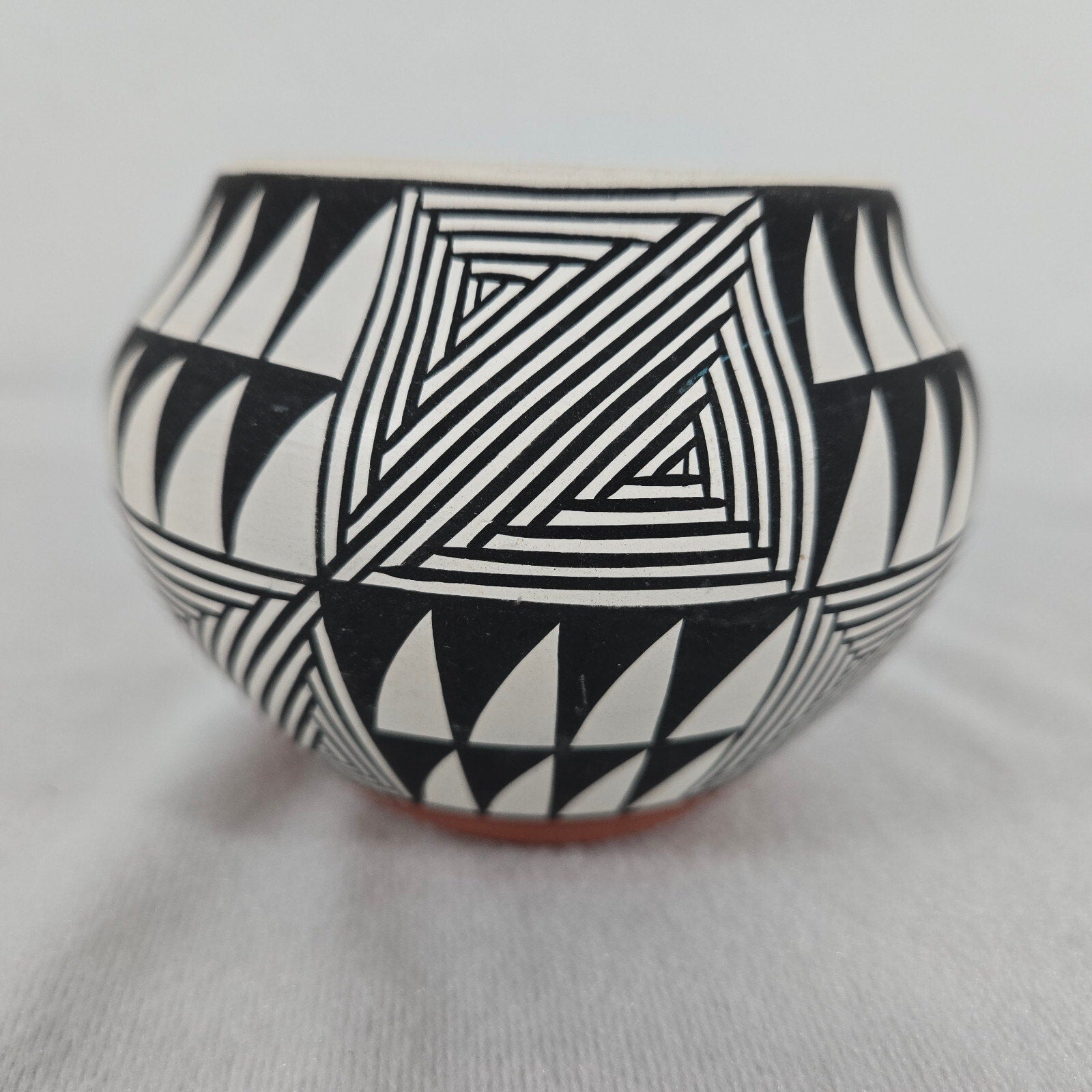 Acoma pottery, vintage olla, Ma Aragon, Native American art, Southwestern pottery, polychrome design, signed MA, New Mexico, Acoma Pueblo, traditional pottery, collectible art, vintage jar, black and white, clay art, Pueblo pottery, Southwest art, Native art, handmade pottery, vintage collectible, Acoma art, signed pottery, MA Aragon.