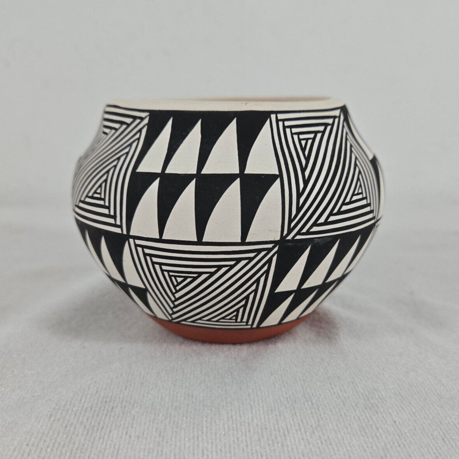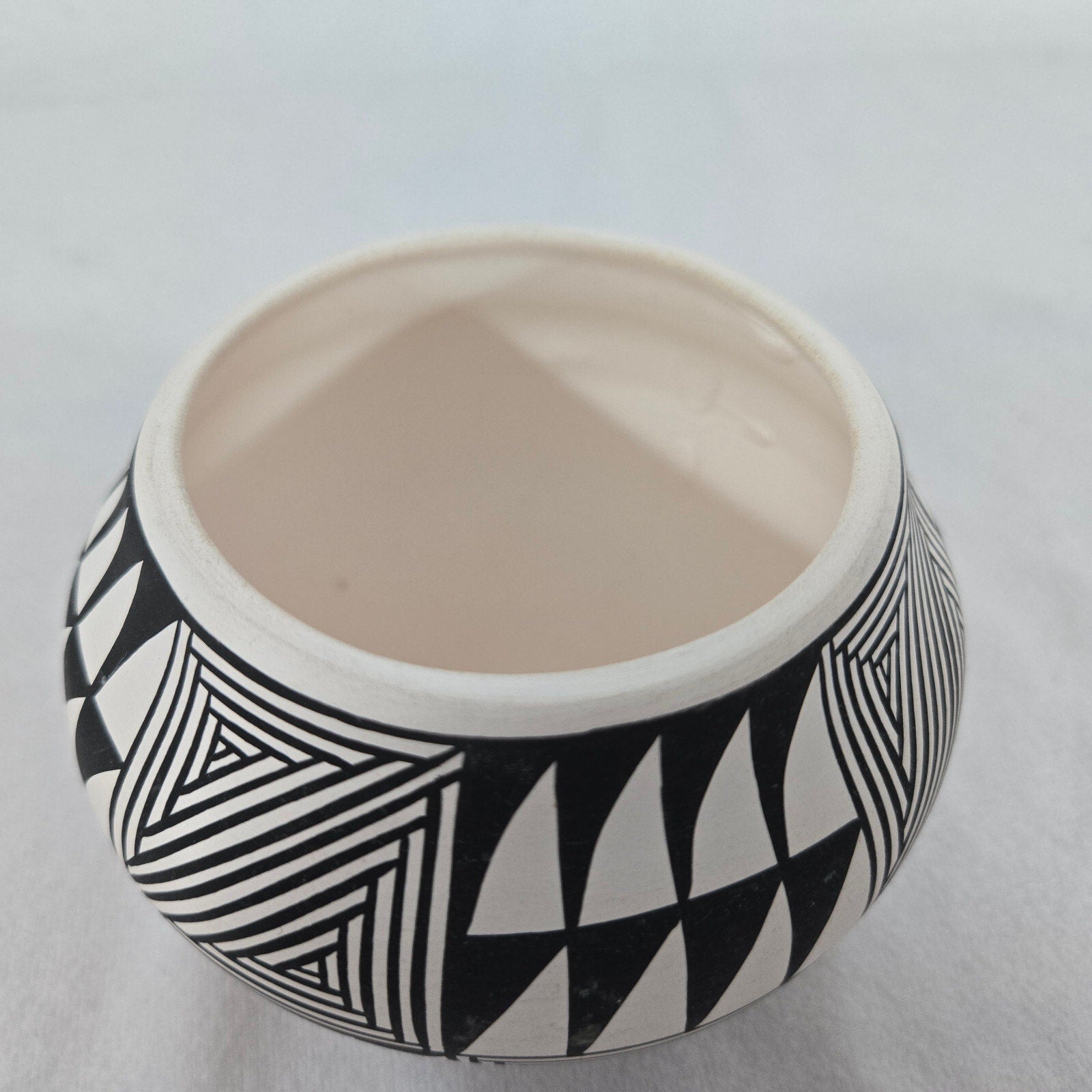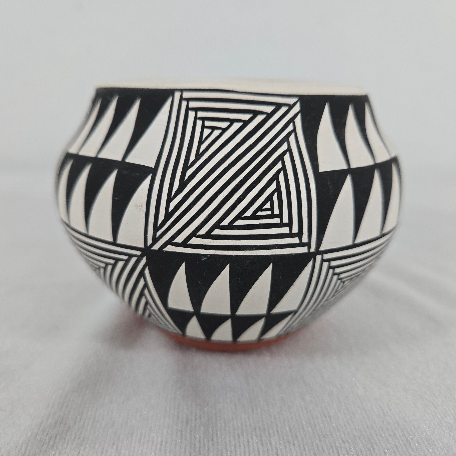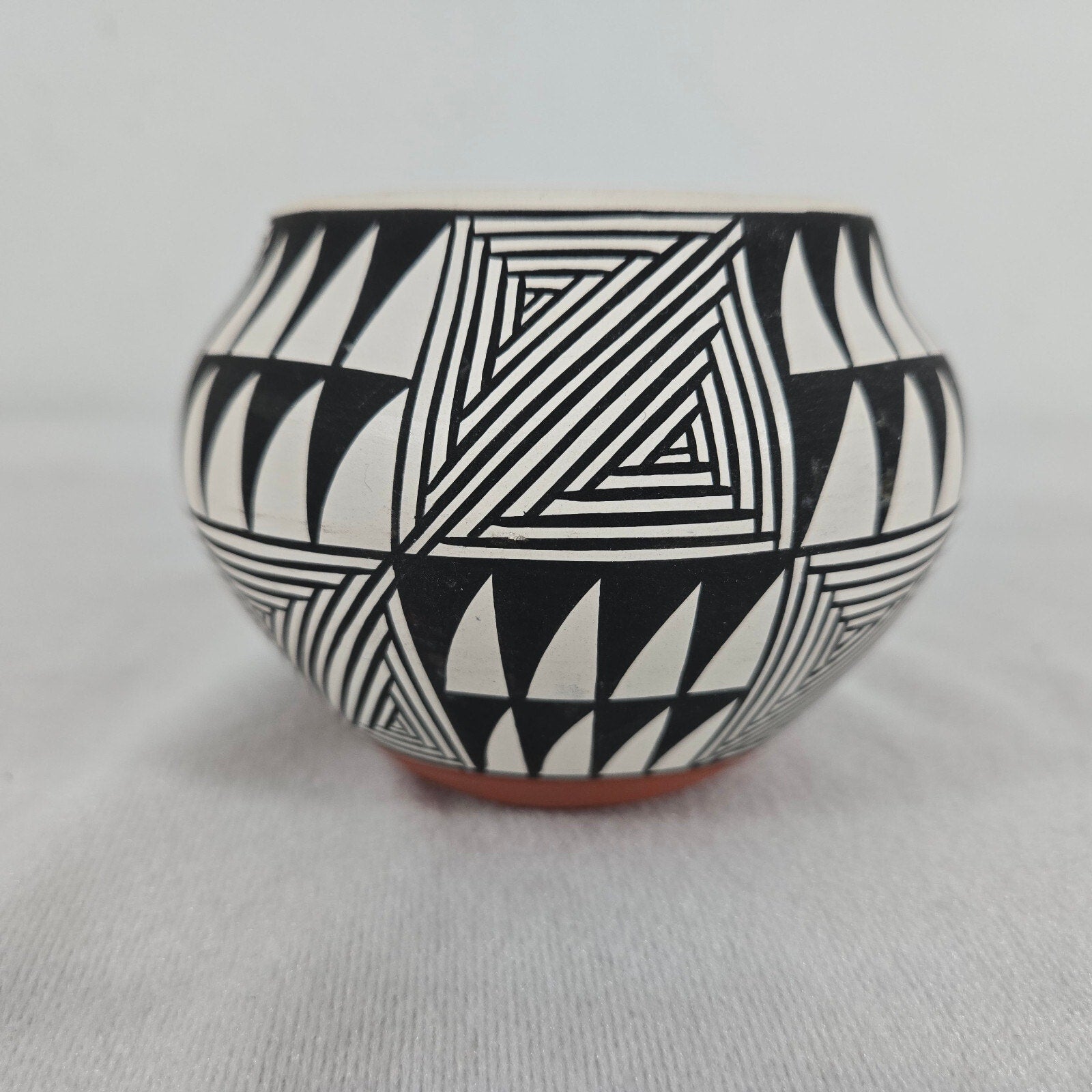 Acoma pottery, vintage olla, Ma Aragon, Native American art, Southwestern pottery, polychrome design, signed MA, New Mexico, Acoma Pueblo, traditional pottery, collectible art, vintage jar, black and white, clay art, Pueblo pottery, Southwest art, Native art, handmade pottery, vintage collectible, Acoma art, signed pottery, MA Aragon.