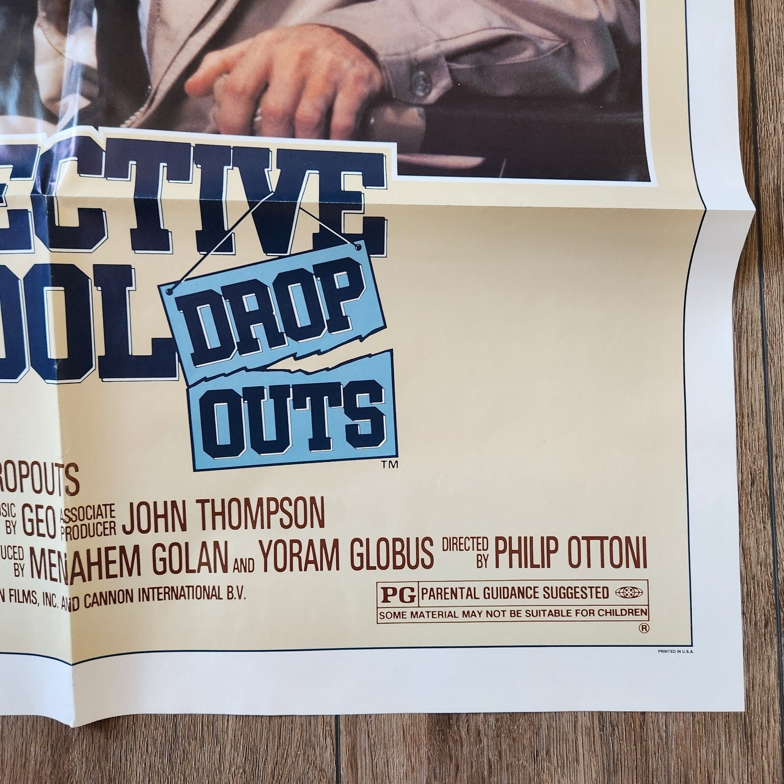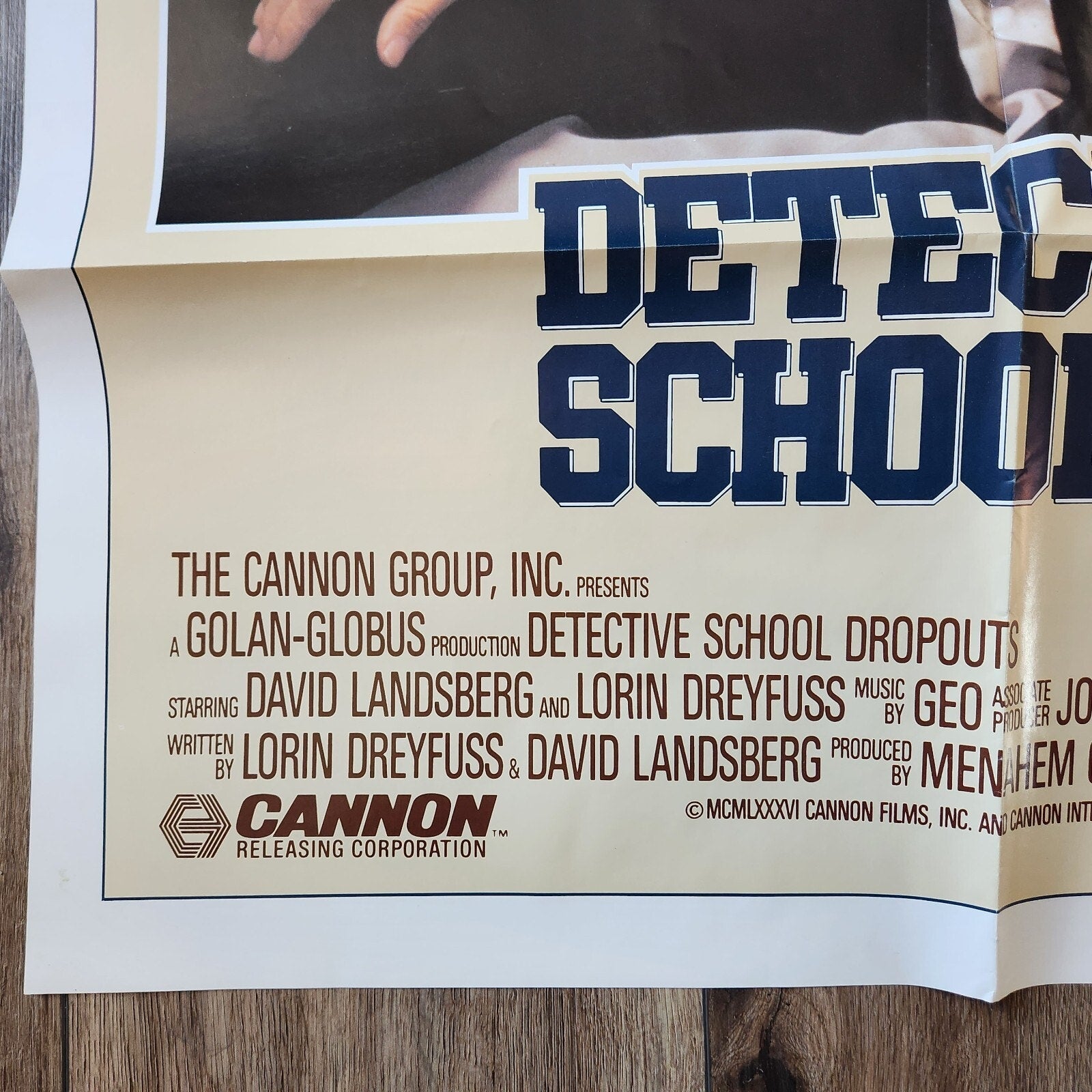 Rare vintage original 1986 Detective School Drop Outs movie poster released by MGM/UA Home Video. Featuring artwork from the cult action-comedy classic starring David Landsberg and Lorin Dreyfuss, this authentic theatrical-size poster (27x41 inches) is in pristine, unused condition. A sought-after collectible for fans of '80s buddy comedies and memorabilia enthusiasts, this item represents a unique piece of home video and pop culture history. Ships rolled and well-protected – perfect for framing or display.