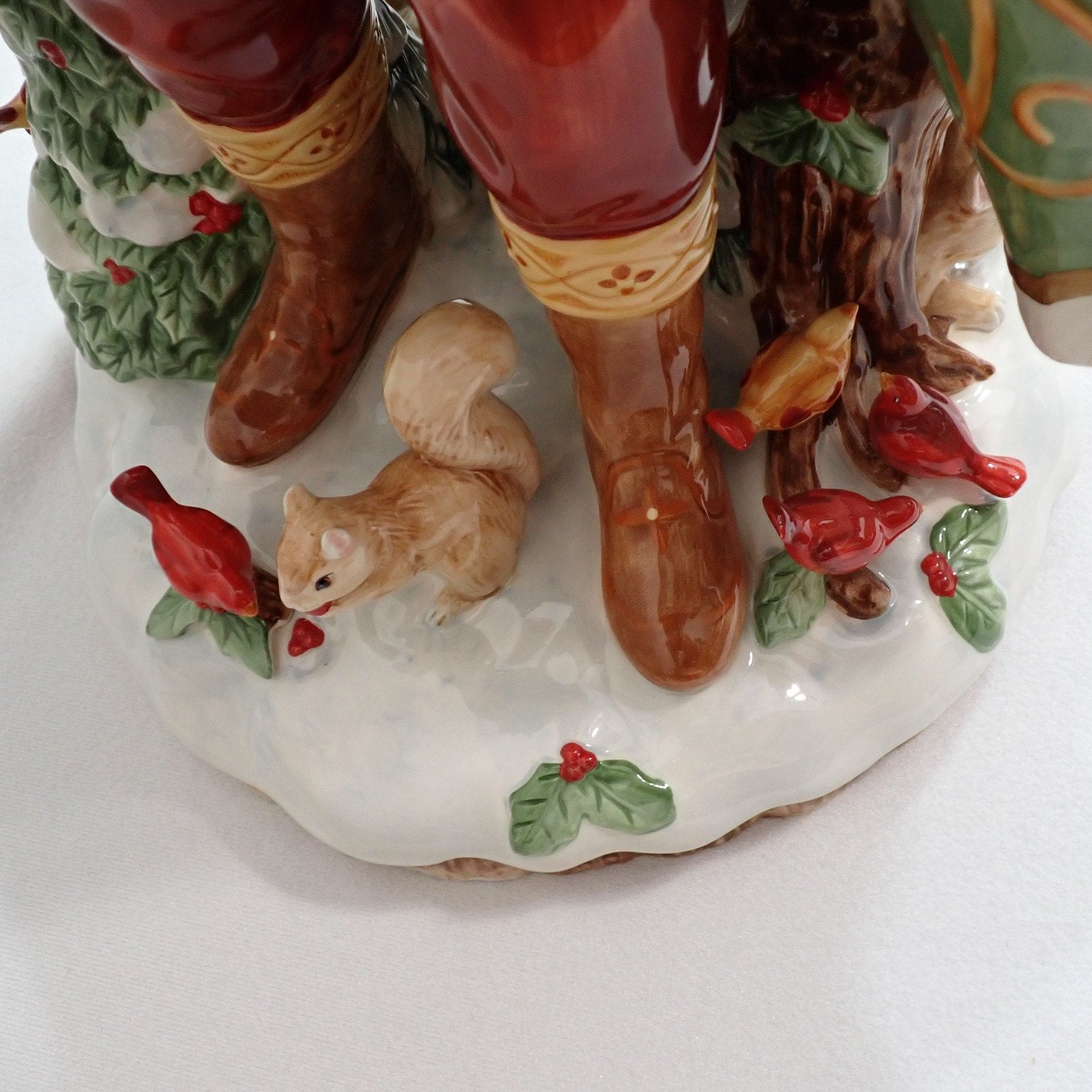 This impressive Fitz and Floyd Bellacara Santa Figurine stands approximately 19" to 20" tall and is beautifully hand-painted with intricate detail, making it a standout centerpiece for any holiday décor. Crafted from quality ceramic/earthenware, Santa is depicted in vibrant holiday attire holding a decorated tree, surrounded by woodland animals, and accented with gold trim. Released in 2008, this collectible piece is substantial and heavy, making it ideal for display on mantels, tables, or as a festive focal point.