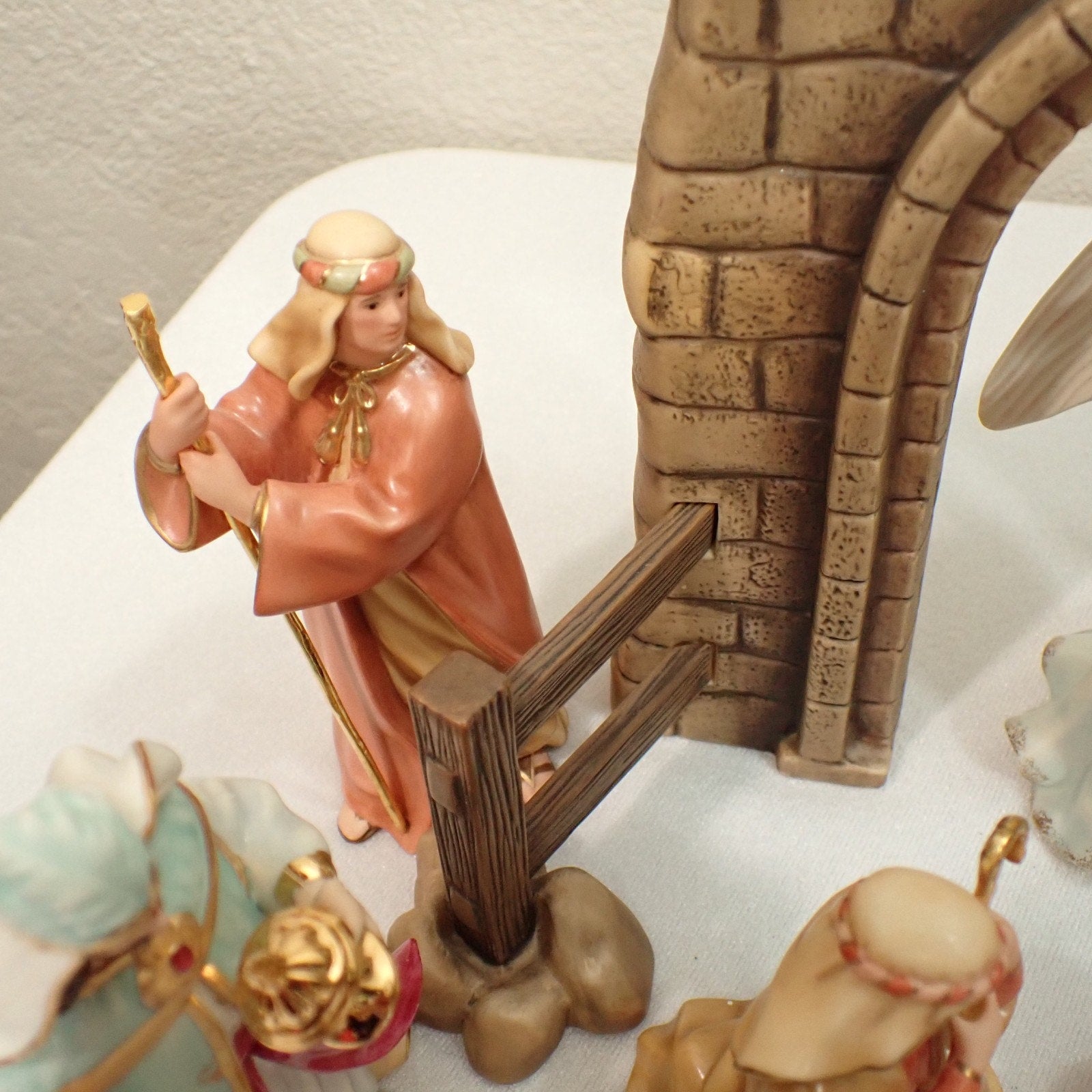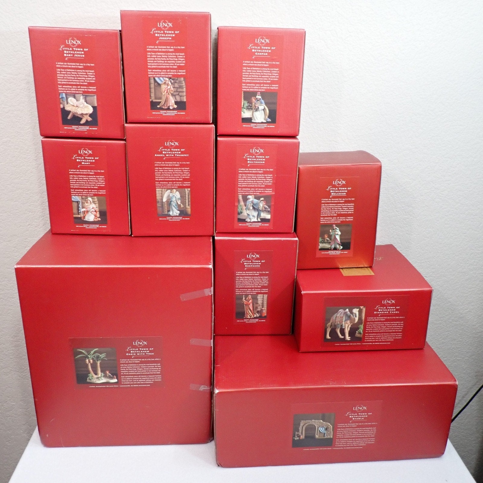 Lenox, Little Town Bethlehem, nativity set, Christmas decor, porcelain figures, holiday collectible, boxed nativity, hand painted, gold accent, Lenox 11 piece, baby Jesus, Mary Joseph, wise men, shepherd boy, angel trumpet, standing camel, nativity stable, oasis tree, rare Lenox, collector set