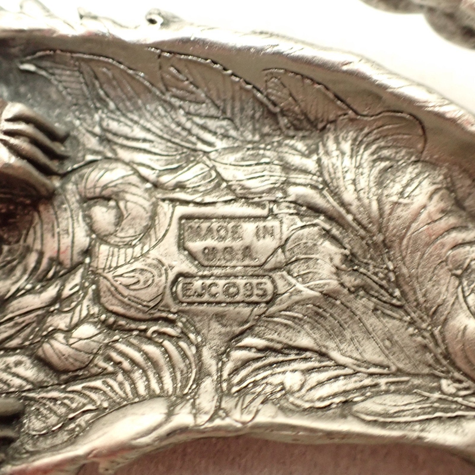 This vintage EJC pewter belt buckle features a striking sculpted American Bald Eagle head with extraordinary detail, framed by a rope-style oval border and mountains. Made in the USA in 1995 and suitable for a 1-3/4" belt, this collectible buckle is a perfect gift. EJC belt buckles are renowned for their craftsmanship and iconic Western designs, making this item a standout addition for collectors or Western fashion enthusiasts. The back is marked “Made in U.S.A.” and “EJC © 95,” attesting to its authenticity and collectible value.