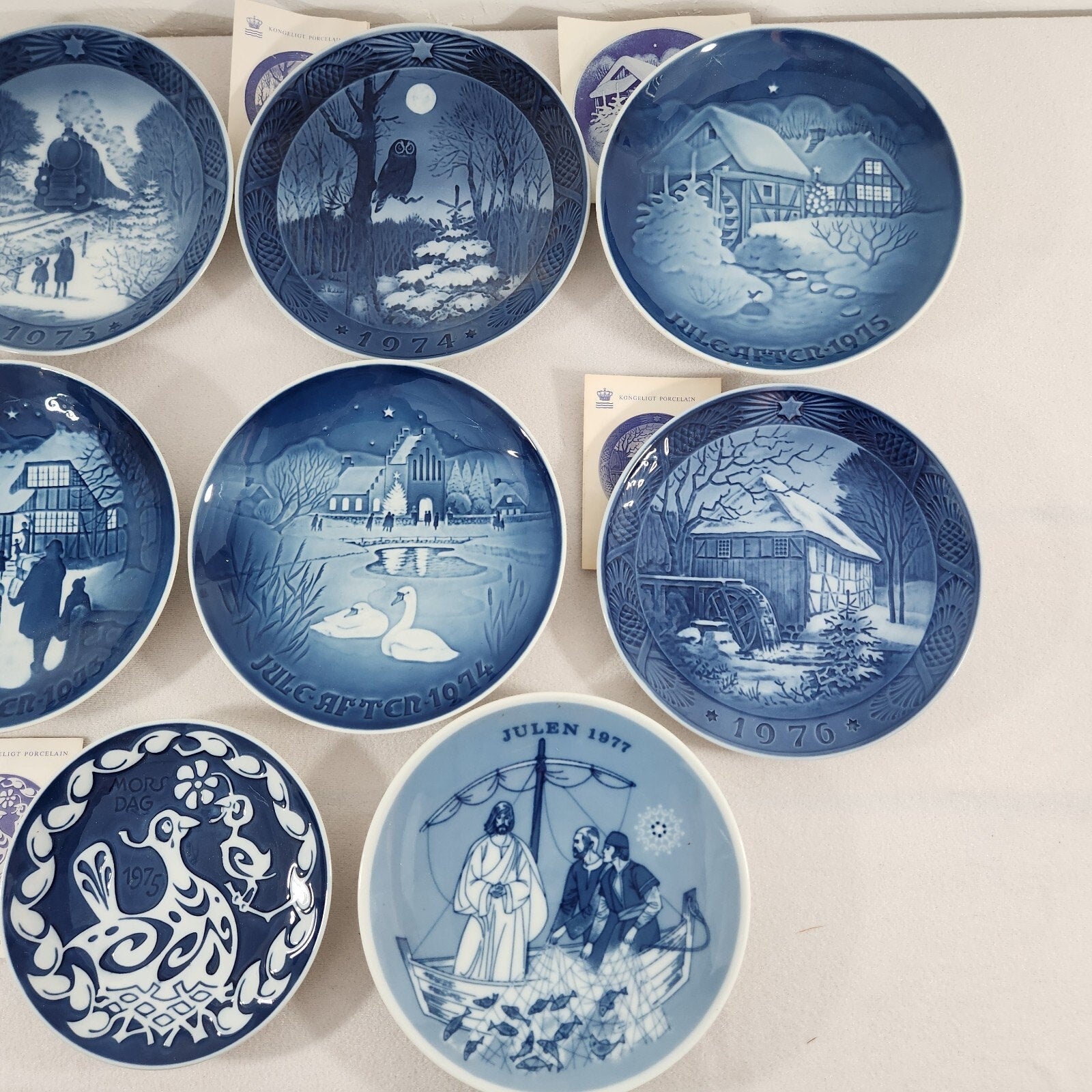 Porsgrund, Christmas plate, 1977, Norway, Julen, collectible, porcelain, Draught of Fishes, biblical, annual plate, Norwegian, vintage, limited edition, holiday decor, gift, Royal Copenhagen, 1973, Christmas plate, Kai Lange, Going Home, collectible, porcelain, Danish, blue white, annual plate, bone china, vintage, holiday decor, winter scene, train, Bing Grondahl, 1973, Copenhagen, porcelain, collectible, Country Christmas, Danish, blue white, vintage, annual plate, B&G