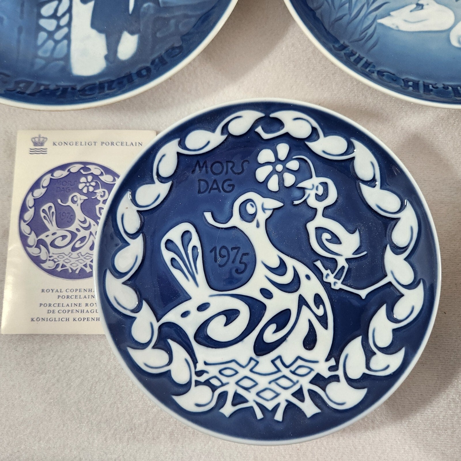 This exquisite 1975 Royal Copenhagen Mother's Day plate (Mors Dag) features a charming design of a bird with its chick, symbolizing the bond between mother and child. Crafted with the renowned quality of Royal Copenhagen, this plate is a perfect addition to any collector's display or a thoughtful gift for a mother figure. The plate showcases the skillful artistry Royal Copenhagen is known for, with delicate hand-painted details and the iconic blue and white color scheme. It is part of the annual Mother's Day series.