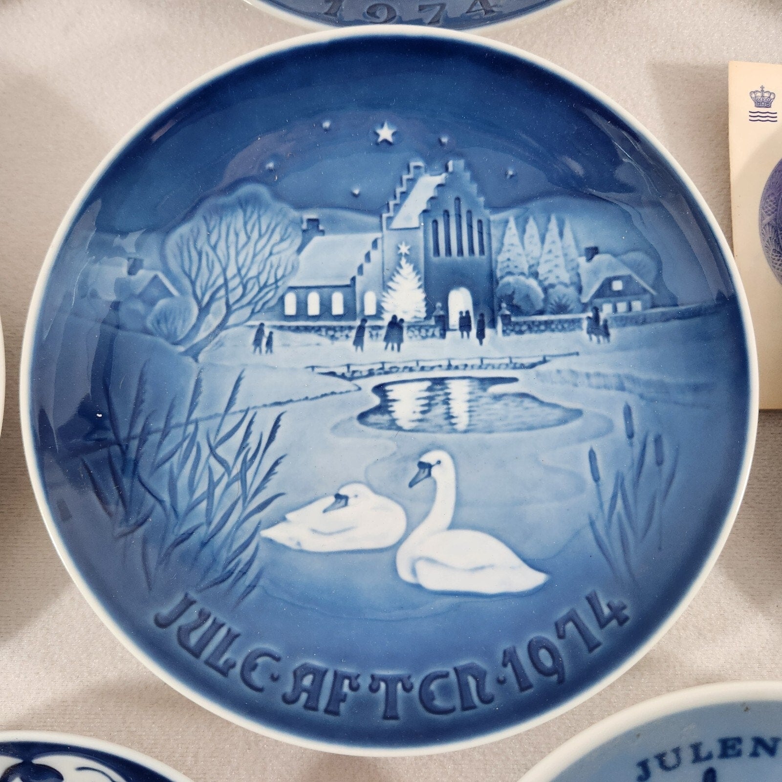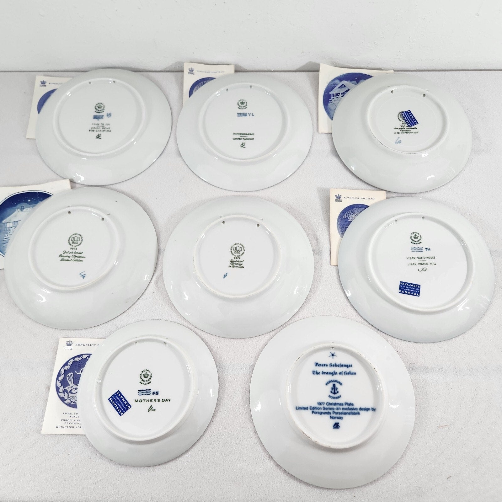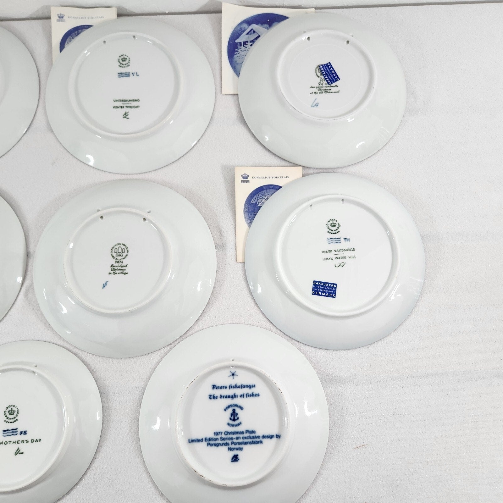 Porsgrund, Christmas plate, 1977, Norway, Julen, collectible, porcelain, Draught of Fishes, biblical, annual plate, Norwegian, vintage, limited edition, holiday decor, gift, Royal Copenhagen, 1973, Christmas plate, Kai Lange, Going Home, collectible, porcelain, Danish, blue white, annual plate, bone china, vintage, holiday decor, winter scene, train, Bing Grondahl, 1973, Copenhagen, porcelain, collectible, Country Christmas, Danish, blue white, vintage, annual plate, B&G