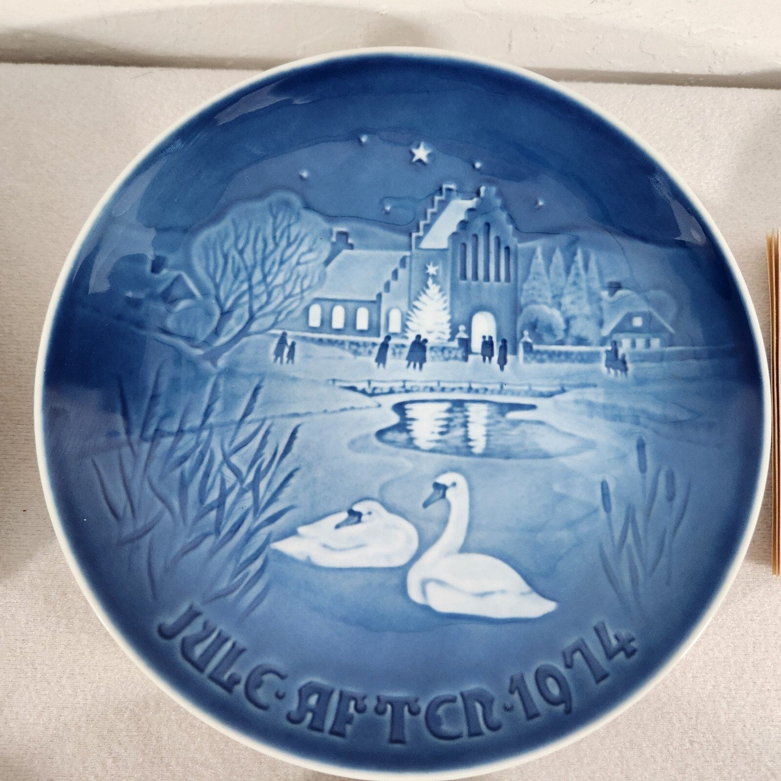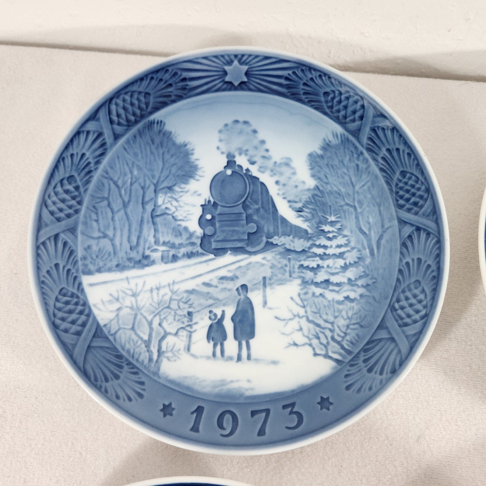 Royal Copenhagen, 1973, Christmas plate, Kai Lange, Going Home, collectible, porcelain, Danish, blue white, annual plate, bone china, vintage, holiday decor, winter scene, train, Bing Grondahl, 1973, Copenhagen, porcelain, collectible, Country Christmas, Danish, blue white, vintage, annual plate, B&G