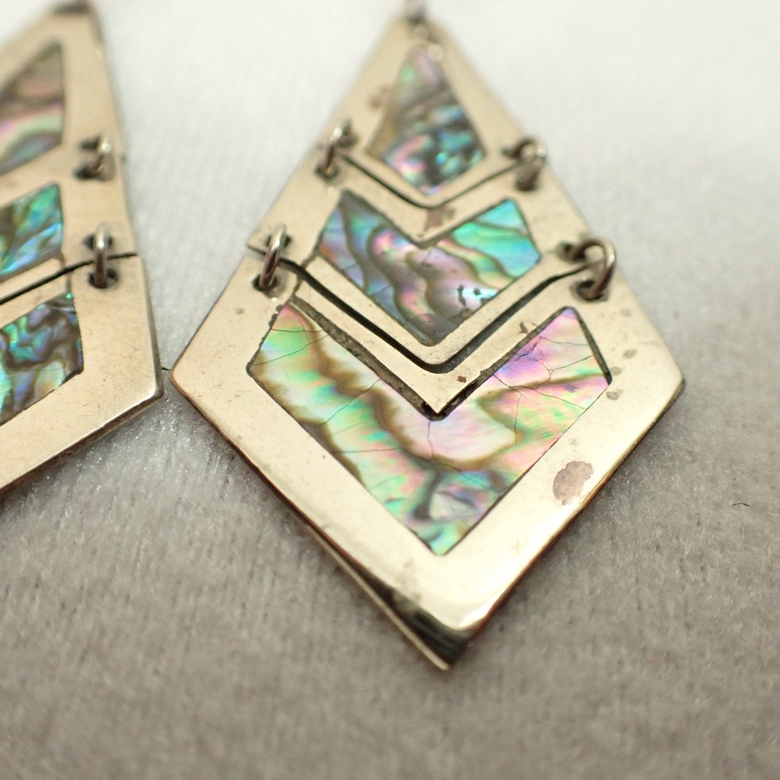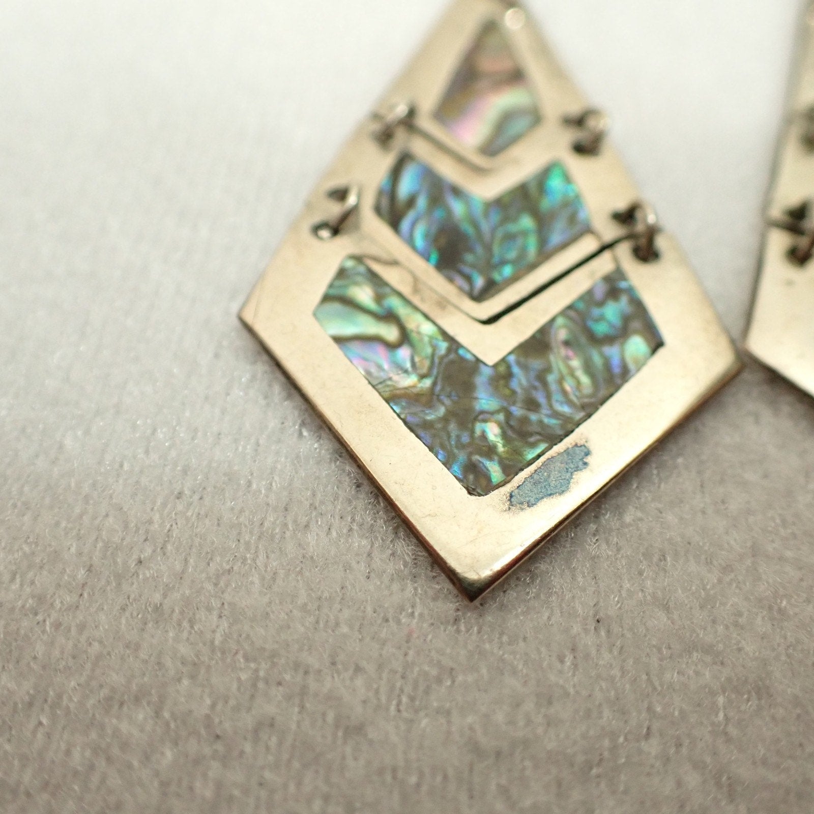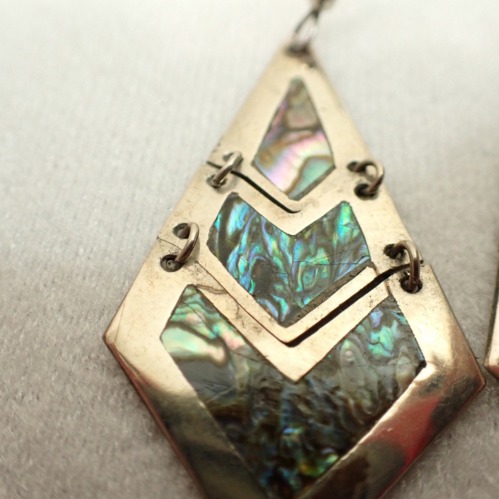 sombras, mexico, abalone, silver, alpaca, vintage, dangle, earrings, geometric, mosaic, shell, inlay, pierced, jewelry, chevron, statement, mid century, retro, artisan, handmade