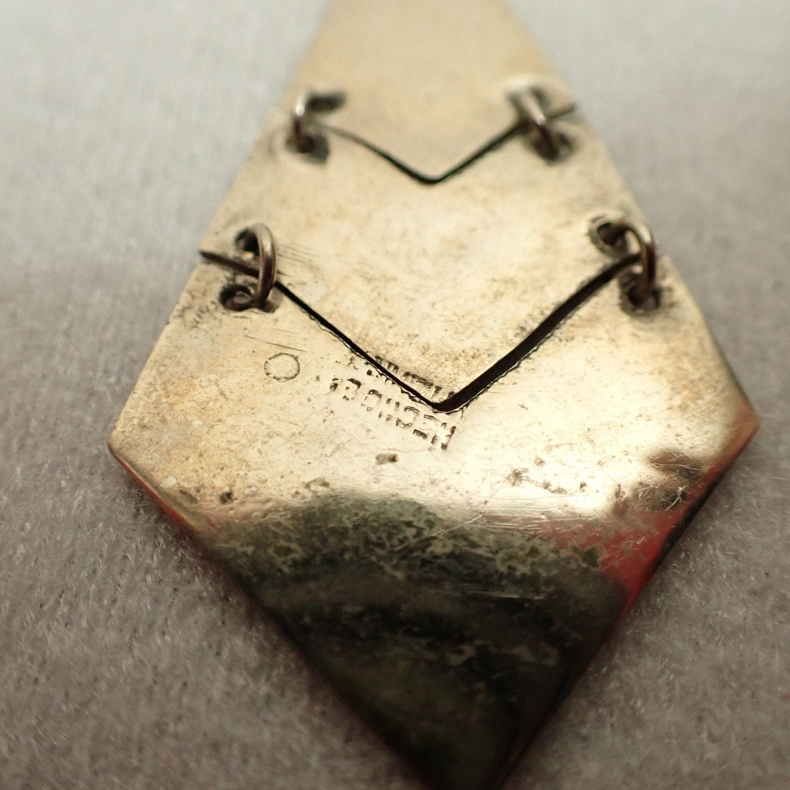 SOMBRAS is a jewelry line from Mexico focusing on fashionable accessories combining native materials like abalone shell with alpaca (German) silver. Mexican alpaca jewelry became popular in mid-century export markets due to its affordability and vibrant shell inlays, reflecting local design and craftsmanship. SOMBRAS pieces are prized for their distinctive geometric motifs and quality construction, found within Mexico’s robust jewelry-making tradition, though specific information about individual designers is often limited for fashion jewelry lines from this period.