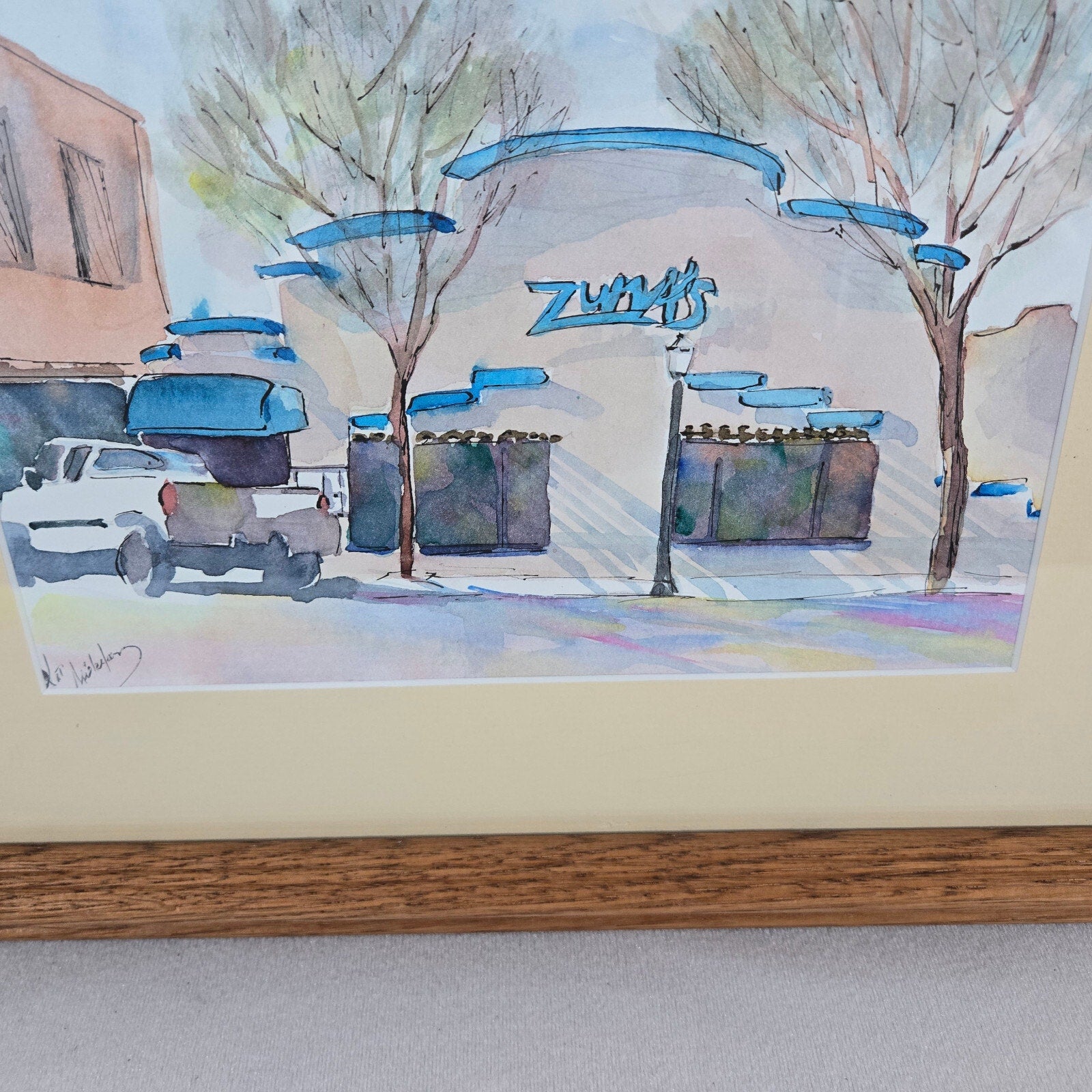 This vintage Southwestern watercolor painting depicts Zummy's Adobe Building with a pickup truck, created by the talented artist Kat Wiederhorn (or similar name -- see the signature in pictures). The piece showcases the artist's skillful use of watercolors to capture the essence of the Southwestern landscape. The vibrant colors and detailed composition make this painting a unique addition to any collection.