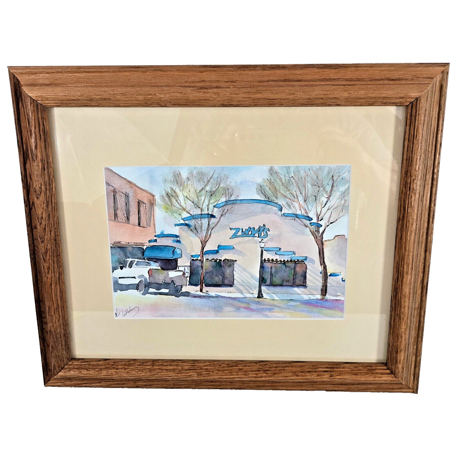 This vintage Southwestern watercolor painting depicts Zummy's Adobe Building with a pickup truck, created by the talented artist Kat Wiederhorn (or similar name -- see the signature in pictures). The piece showcases the artist's skillful use of watercolors to capture the essence of the Southwestern landscape. The vibrant colors and detailed composition make this painting a unique addition to any collection.