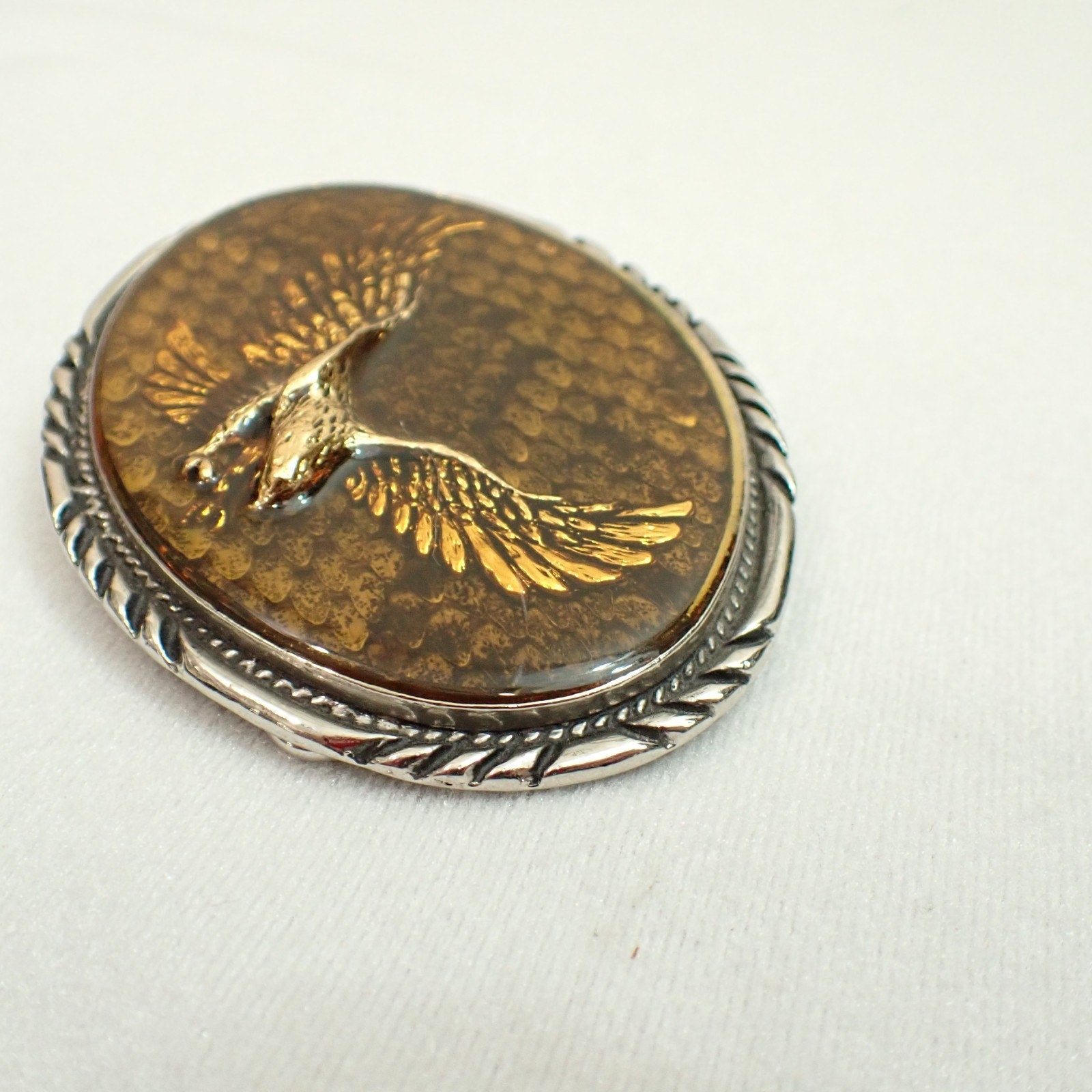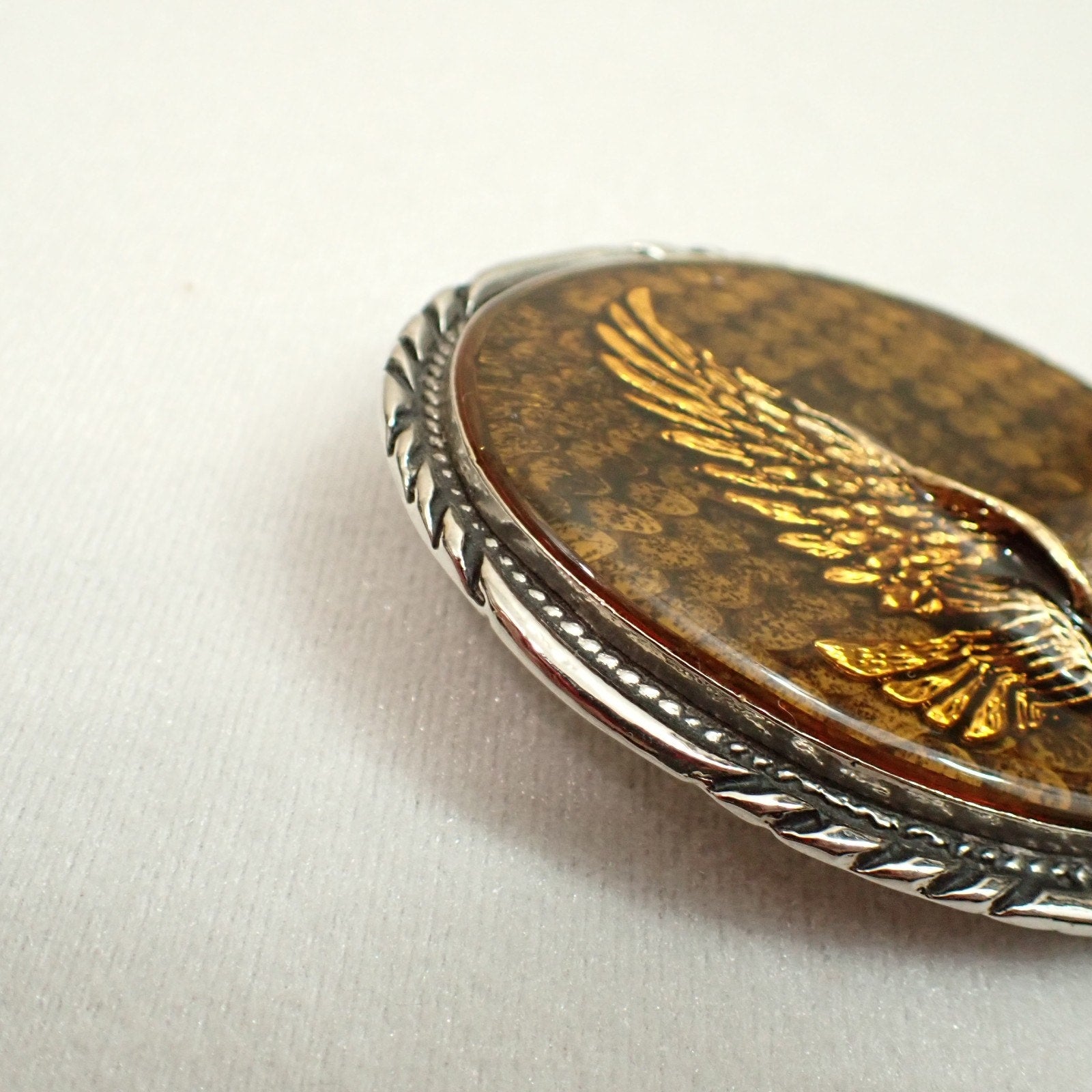Offered is a vintage SSI Diamondback Rattler western belt buckle featuring a striking gold-toned eagle in flight against a unique mottled background, finished with a high-gloss resin dome. This handcrafted heavyweight buckle bears the “S.S.I. Diamondback Rattler Handcrafted USA” marks. Makes this an excellent addition for collectors, vintage fashion enthusiasts, or anyone seeking a bold cowboy statement accessory.
