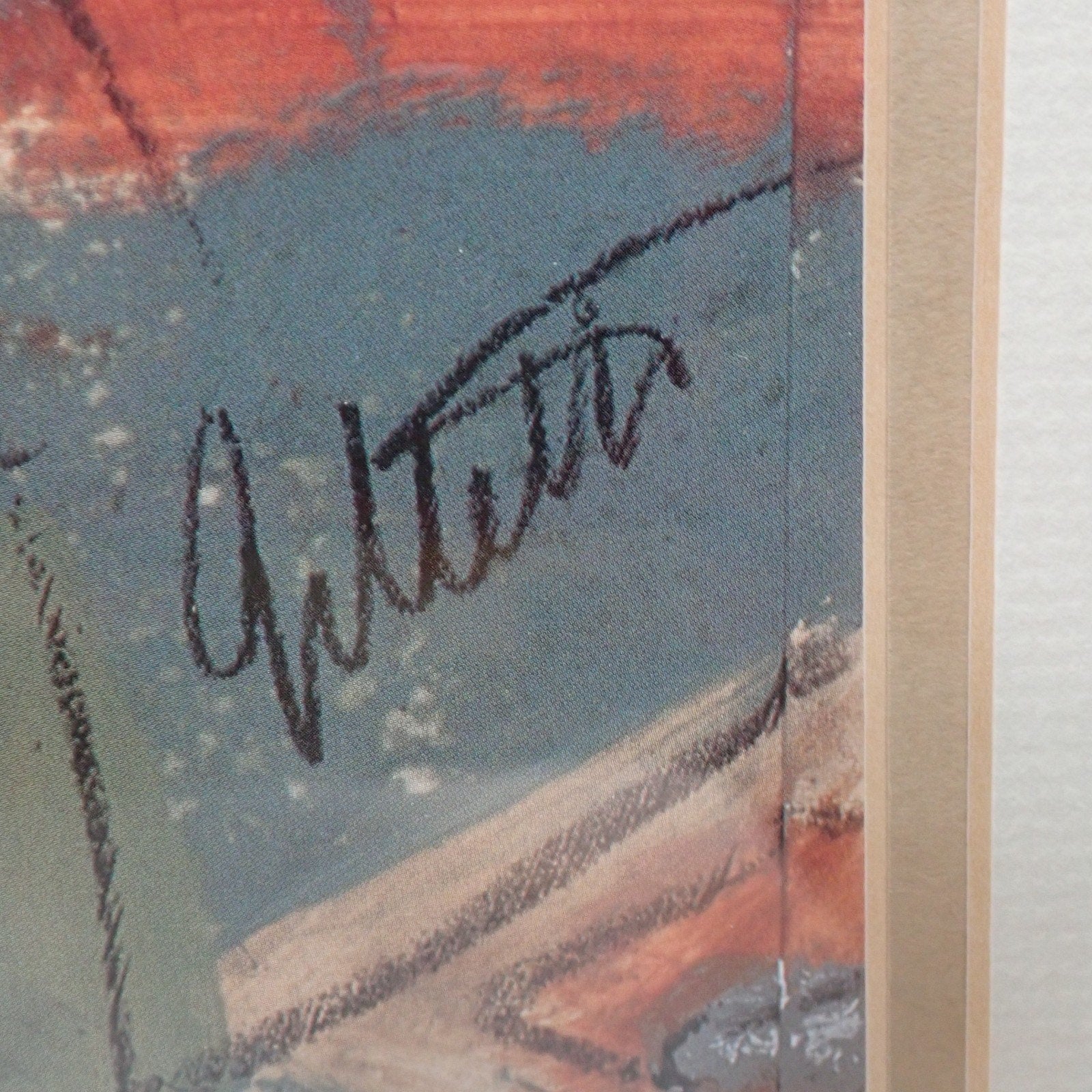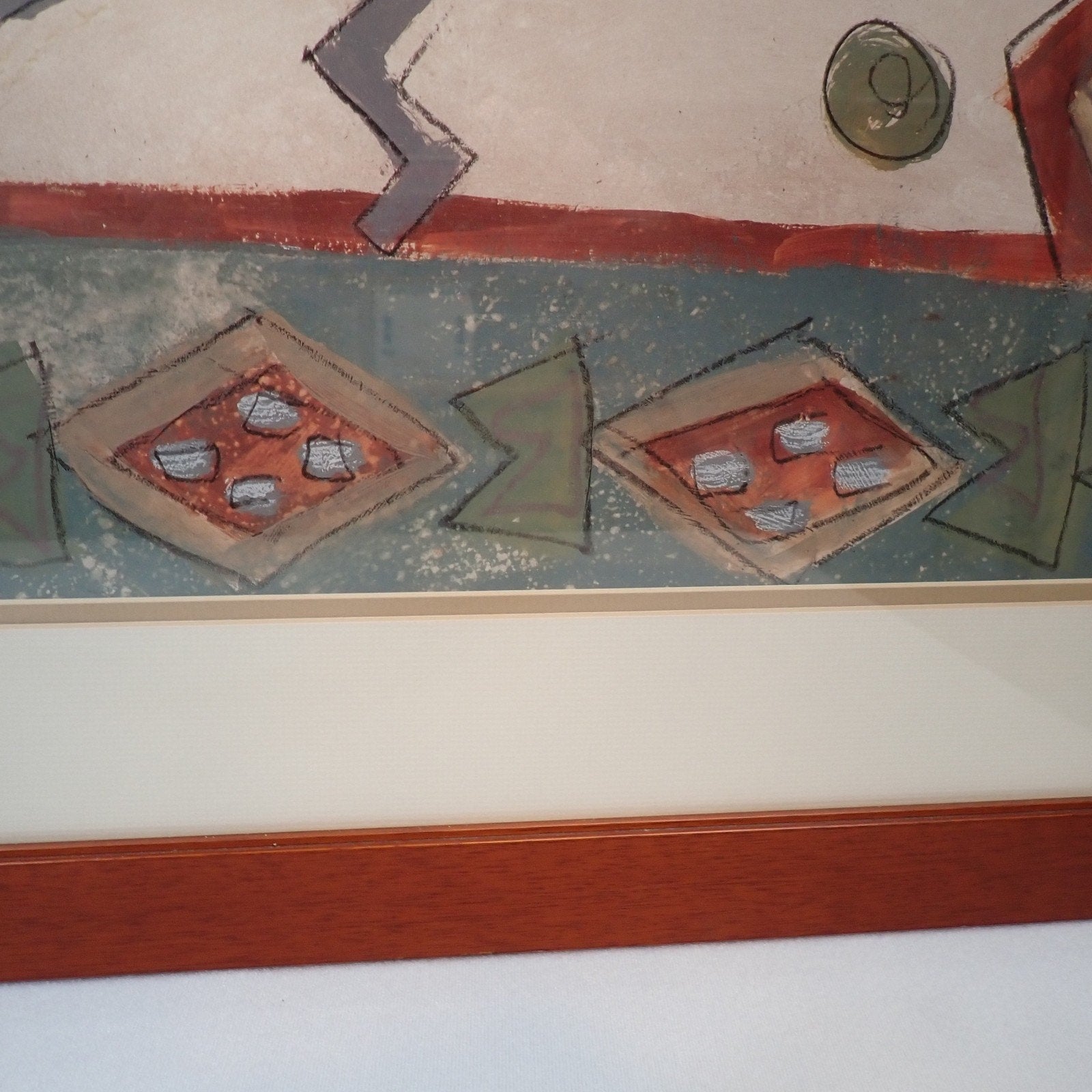 This listing features an original, signed Susan Gillette watercolor artwork titled “Kokopelli Figures Dancing,” presented matted and beautifully framed. Bright, rhythmic figures of Kokopelli are depicted in fluid motion across the composition, reflecting Gillette’s distinctive style inspired by the secret symbols of Southwestern and Native American culture. The painting’s vibrant palette and fine detail highlight the artist’s celebrated mastery in watercolor and her deep connection to nature. The piece is ready to display and would make a striking addition to any fine Southwest, Southwestern, or modern art collection.