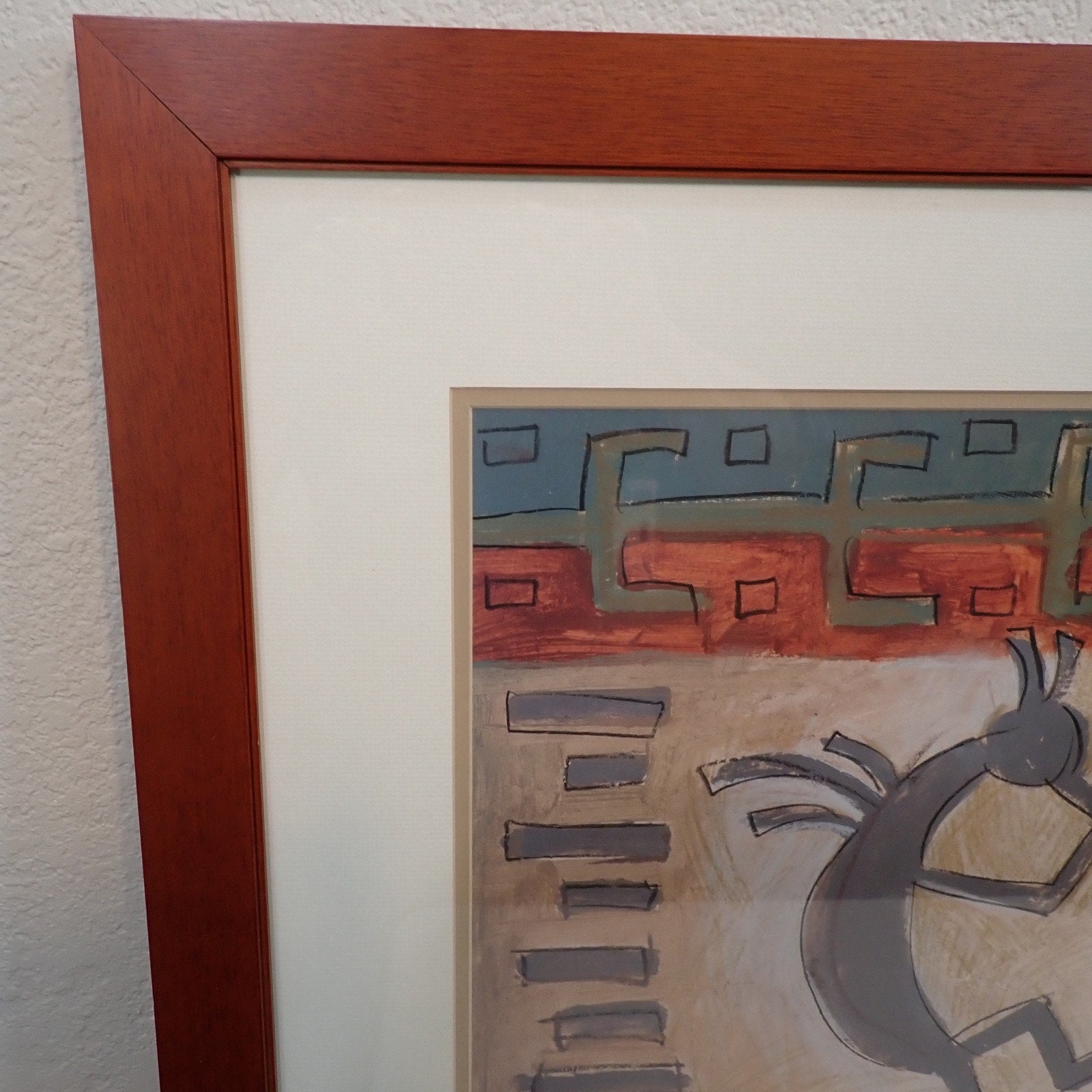 Susan Gillette, Kokopelli art, Southwest painting, Arizona artist, dancing figures, Native American, contemporary watercolor, framed art, signed artwork, matte artwork, Gillette original, Scottsdale art, desert motif, spiritual figures, Sonoran arts