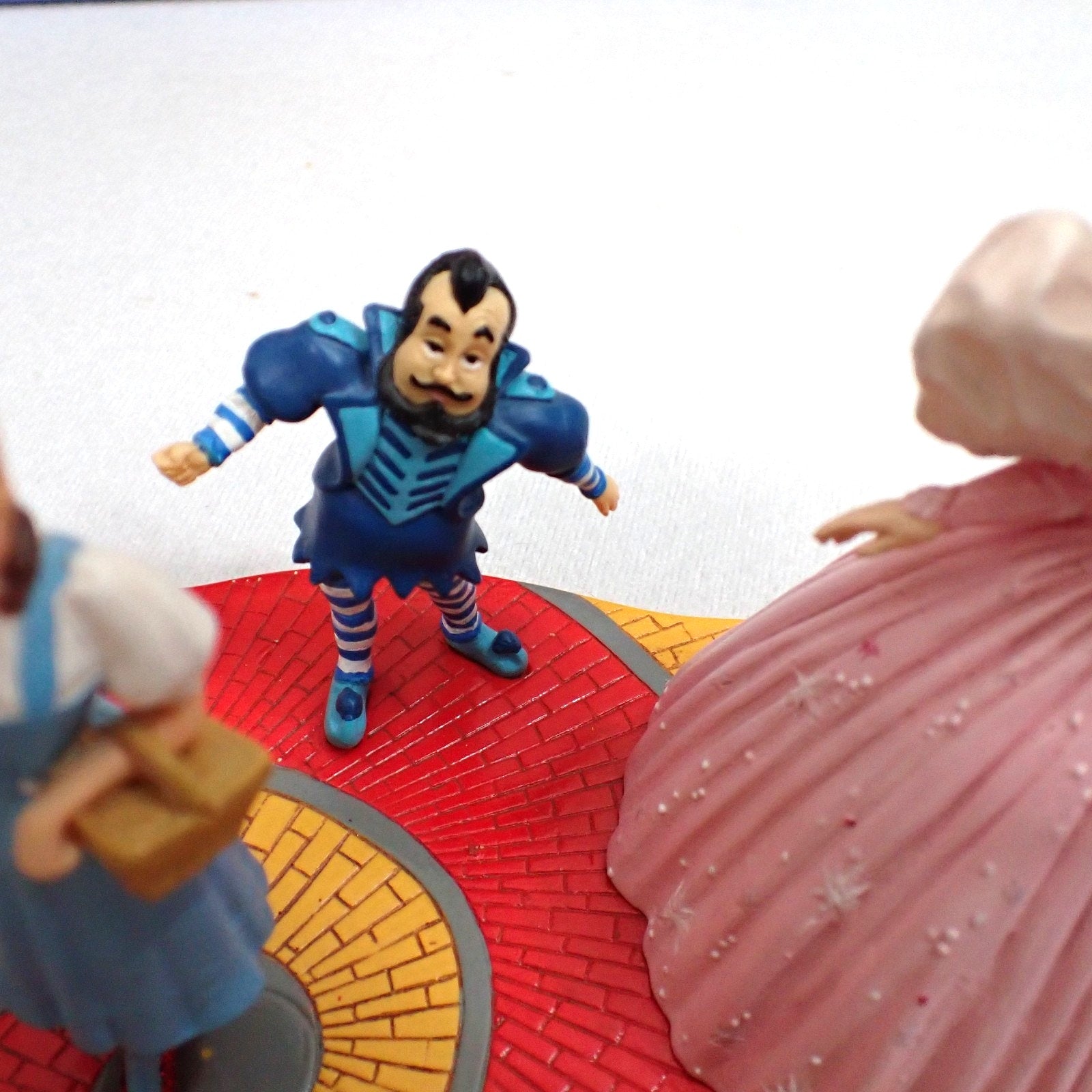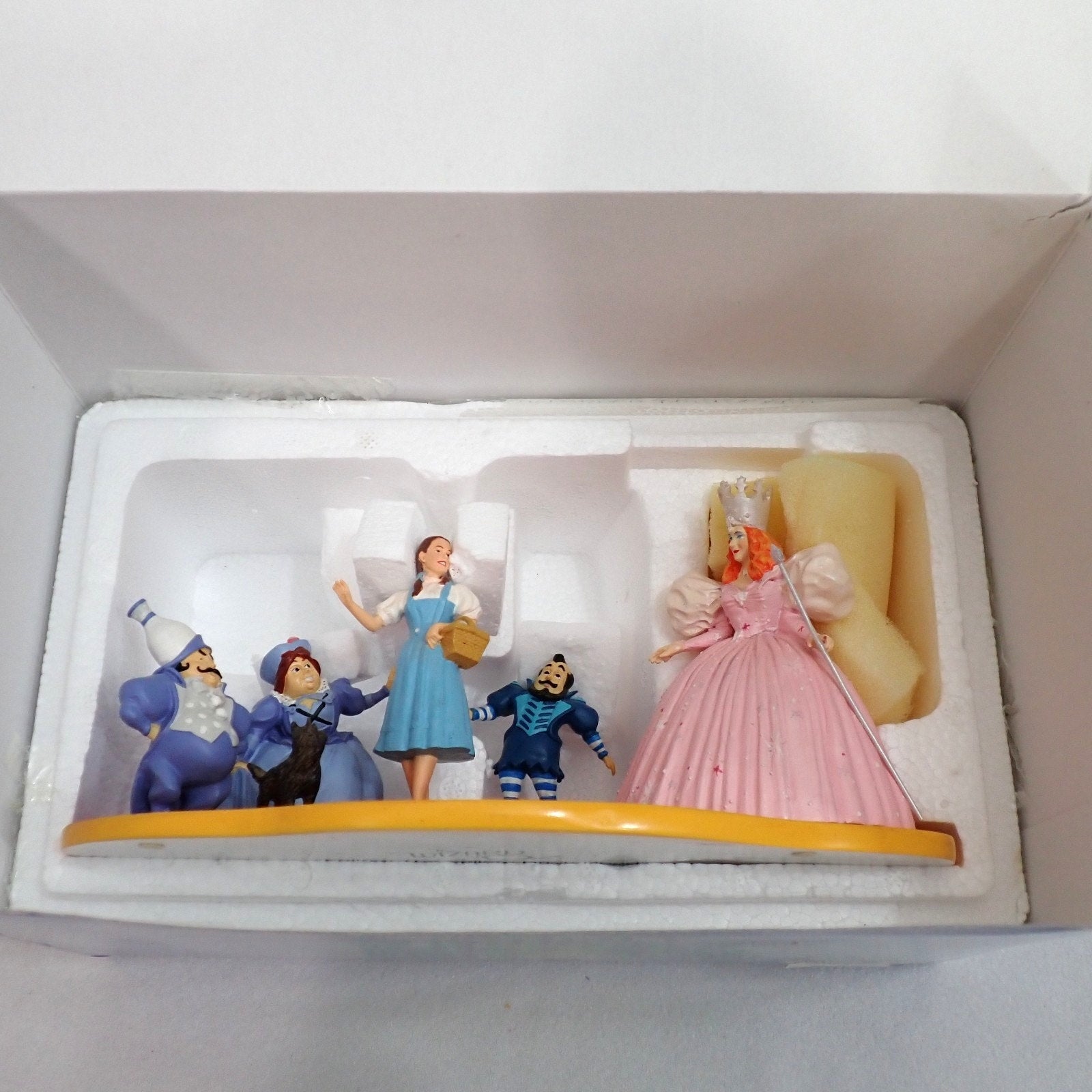 Included: Figurine scene with Dorothy, Toto, Glinda, and Munchkins on yellow brick road base (tree/grass base only; separate village buildings not included)