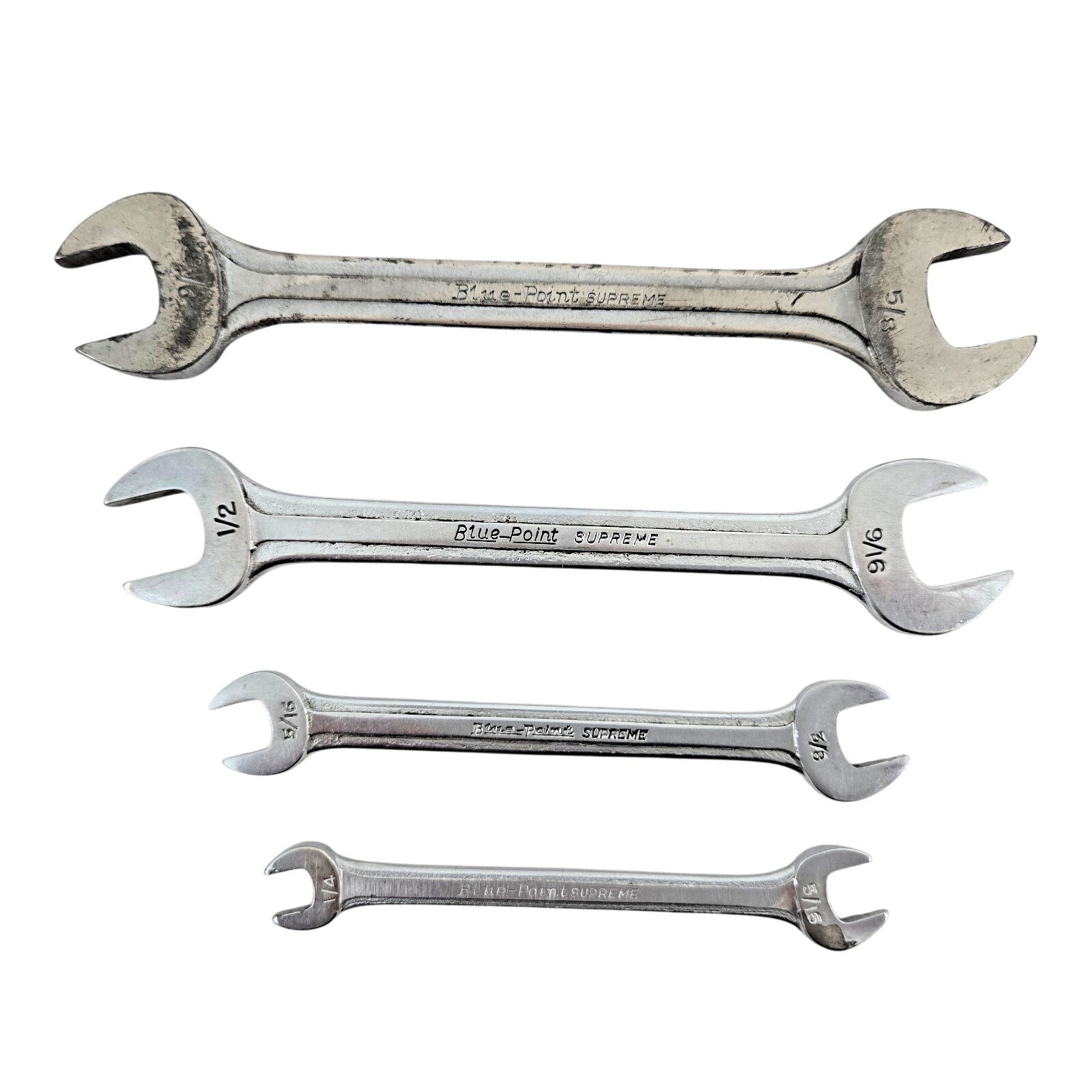 Vintage Blue-Point Supreme 4pc Set SAE Double Open End Wrenches S1820 S1618 S1012 S810 including sizes 5/8", 9/16", 1/2", 3/8", 5/16",1/4"