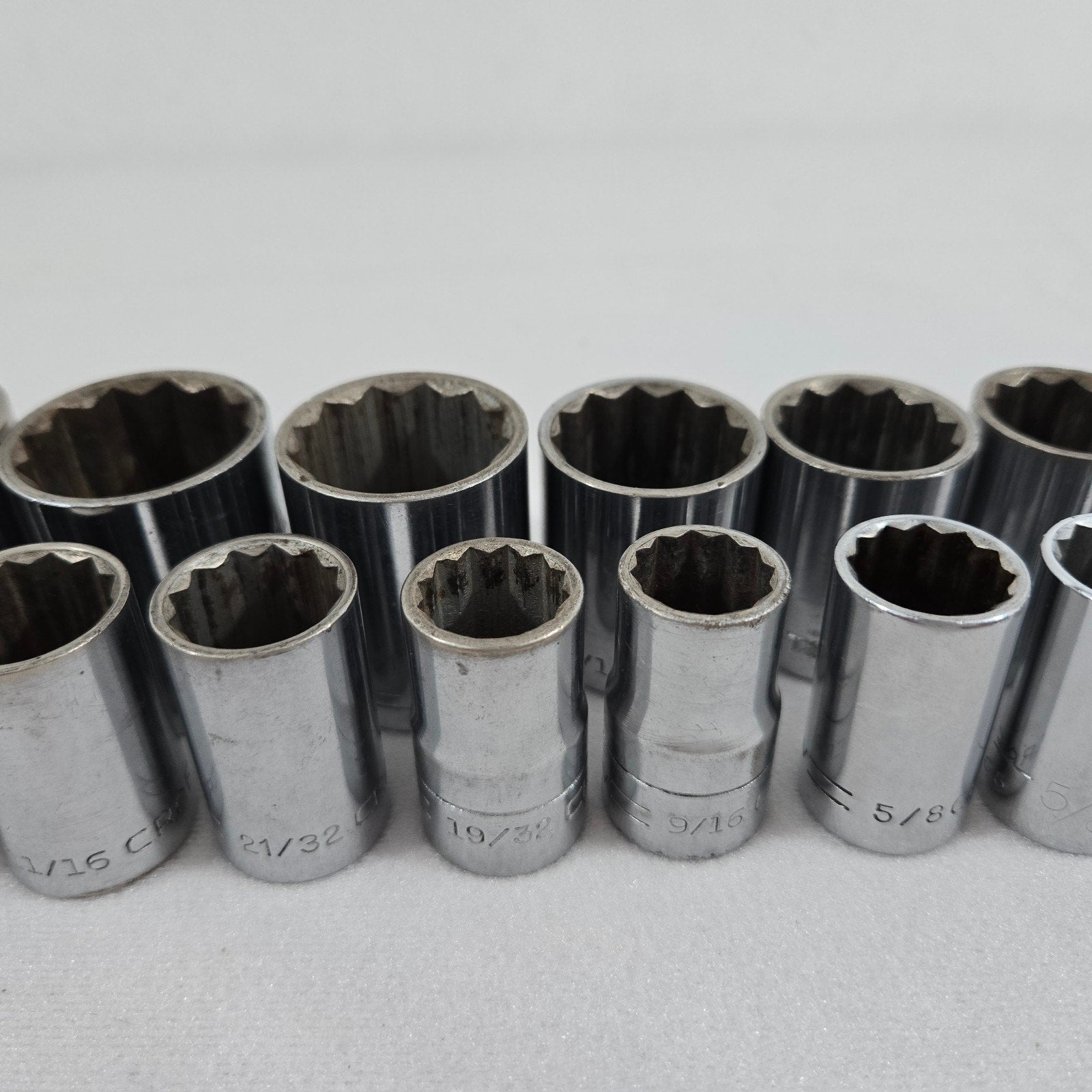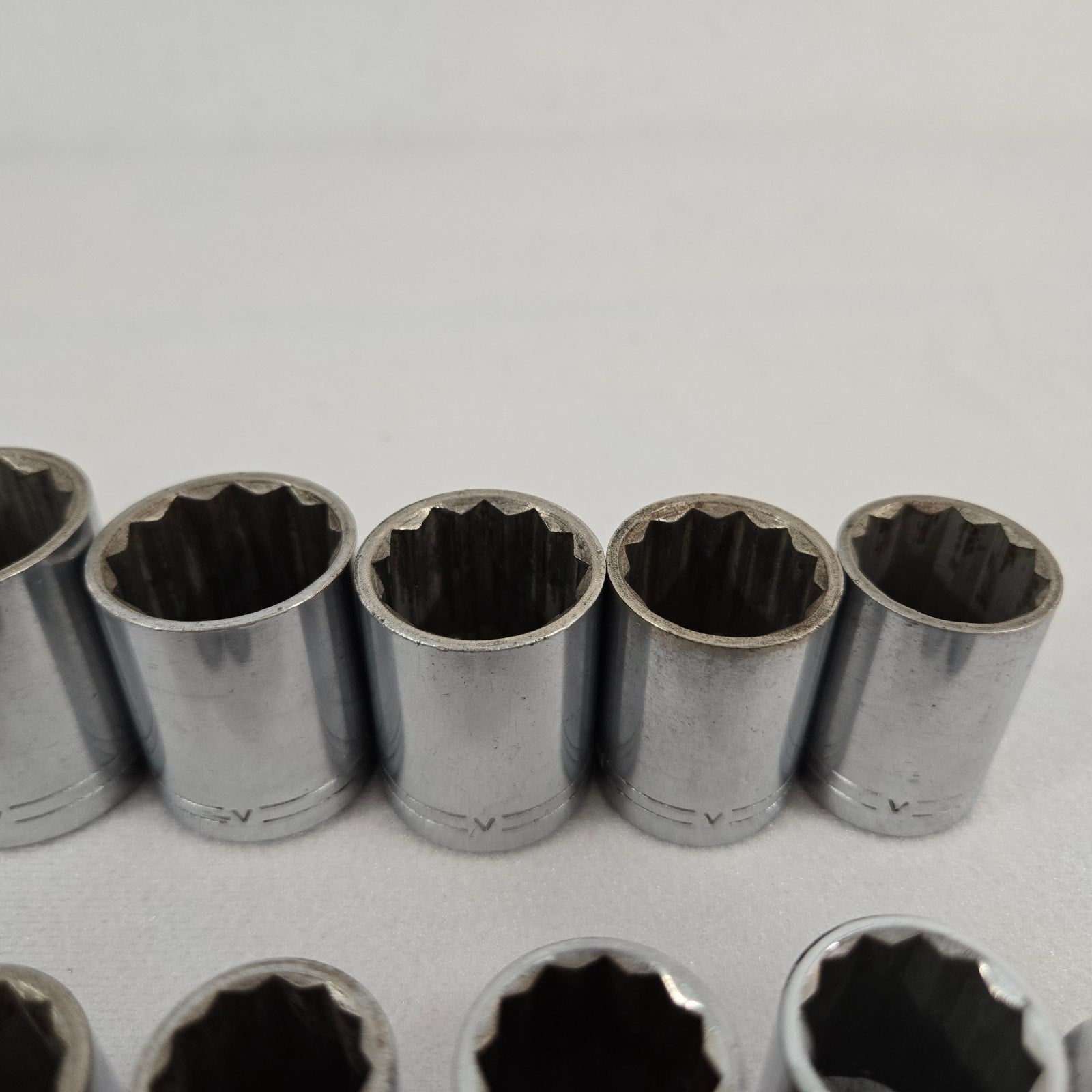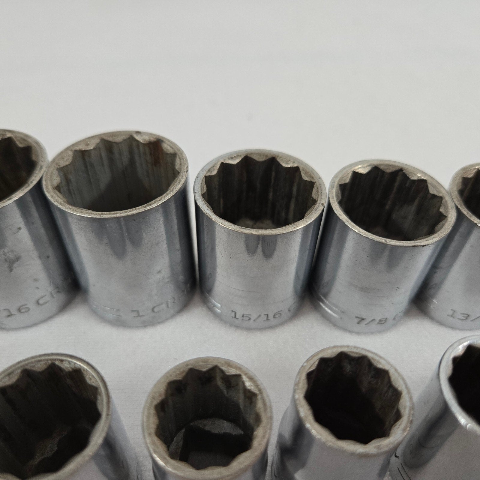 Vintage Craftsman 1/2" Drive V-Series 17 pc SAE 12pt Socket Set w/Universal Joint & 1/2" to 3/8" Drive Reducer - USA Made