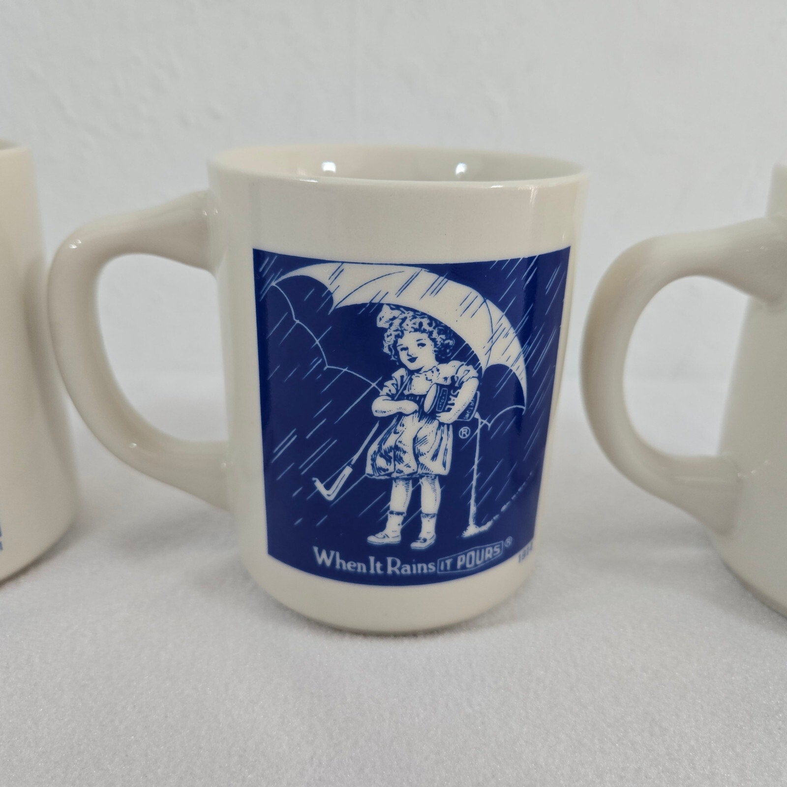 1980s Morton Salt Coffee Mugs: 1914 & 1921 Logos -When It Rains It Pours 3pcs
