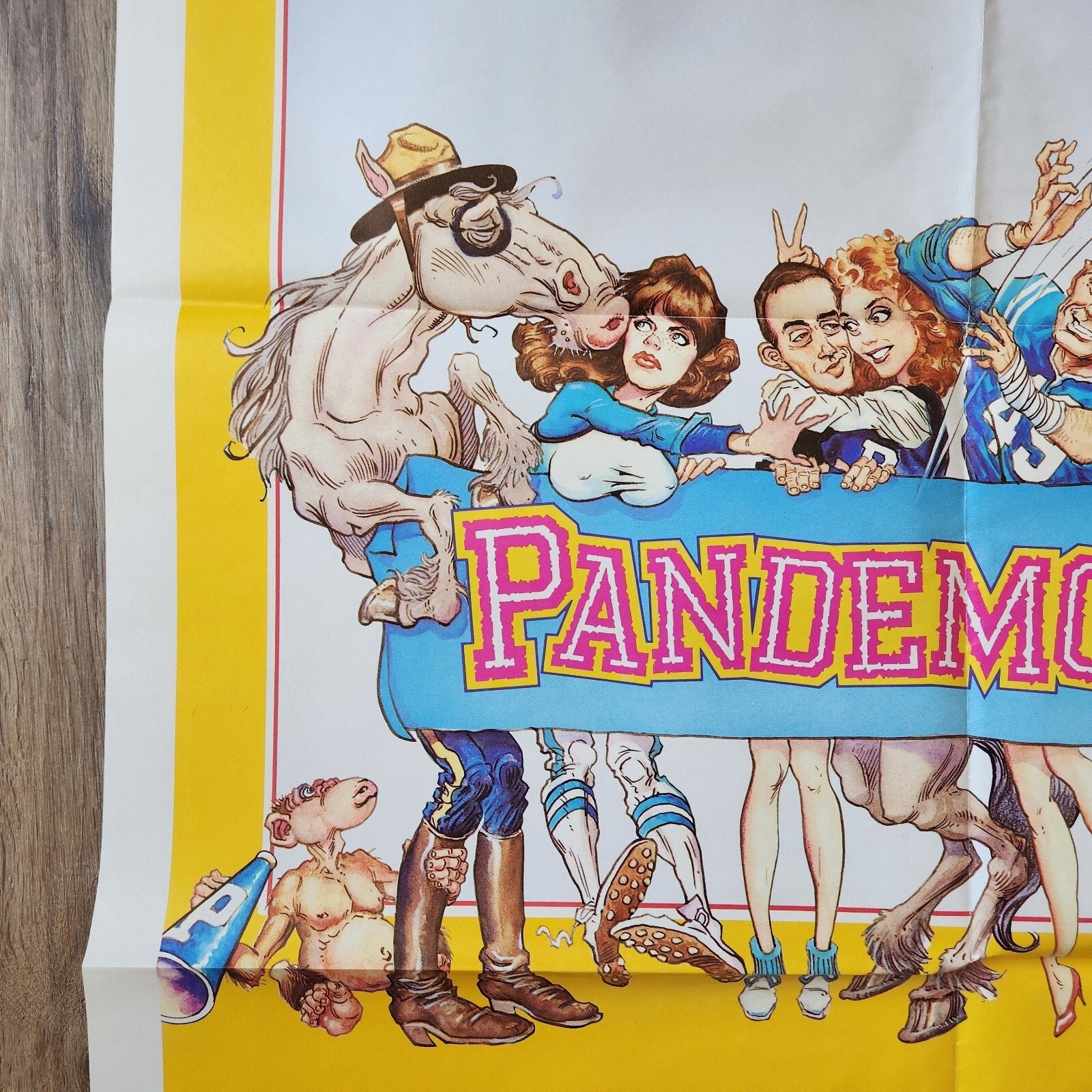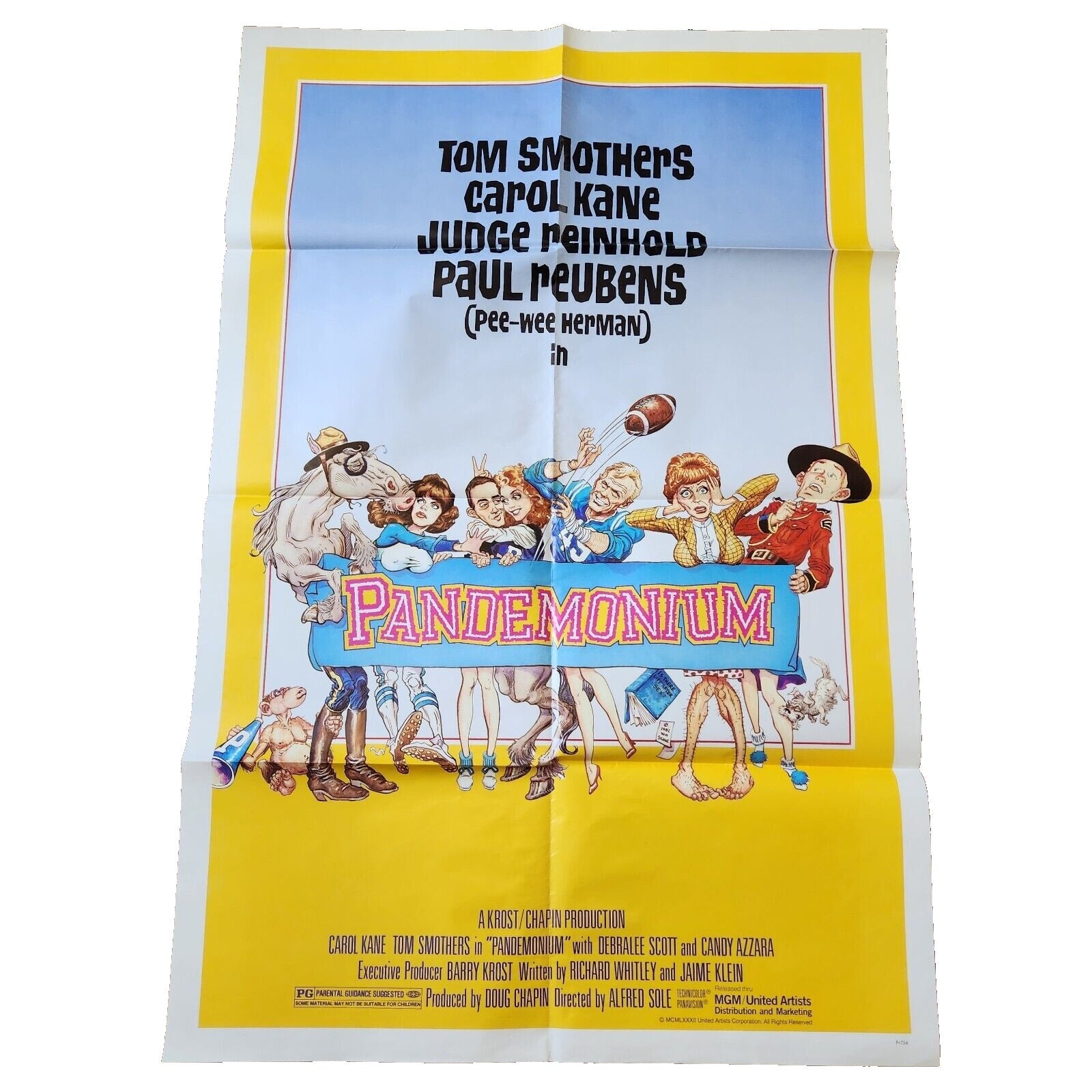 Vintage original 1982 MGM/UA Home Video movie poster for the cult horror-comedy "Pandemonium." This eye-catching full-size (27x41 inches) theatrical one-sheet features vibrant imagery and promotes the film's quirky, all-star ensemble cast. Poster is in "New" condition, having never been displayed, with original factory folds and no pinholes. Ideal for collectors of horror, comedy, or '80s memorabilia. Ships folded as originally issued. Add this rare promotional piece to your vintage movie poster collection!