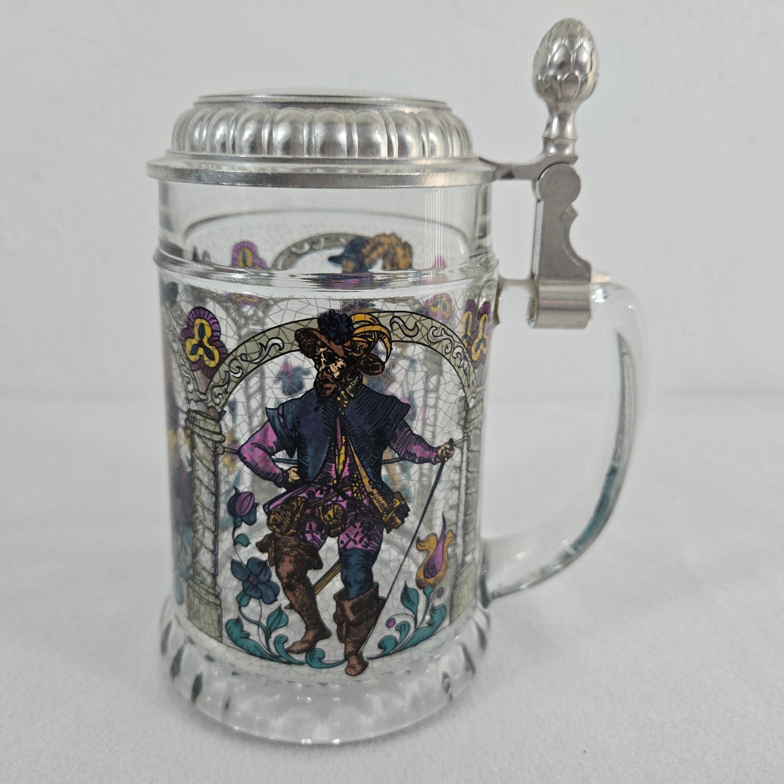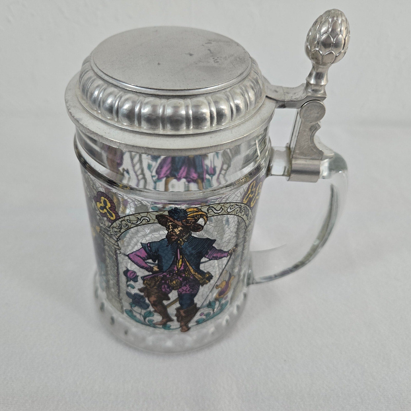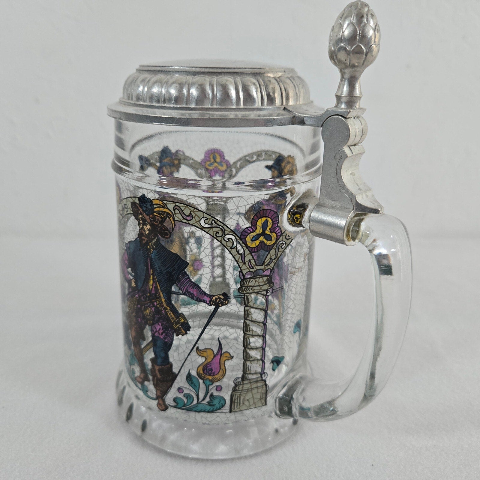 BMFN Three Musketeers Painted Glass Pewter Lidded Beer Stein 7" W. Germany