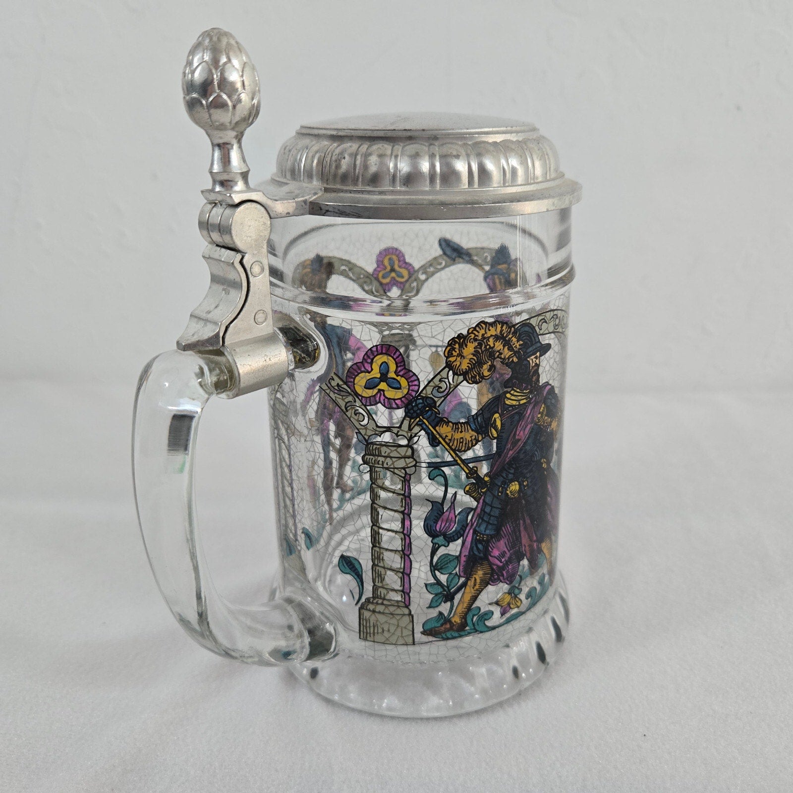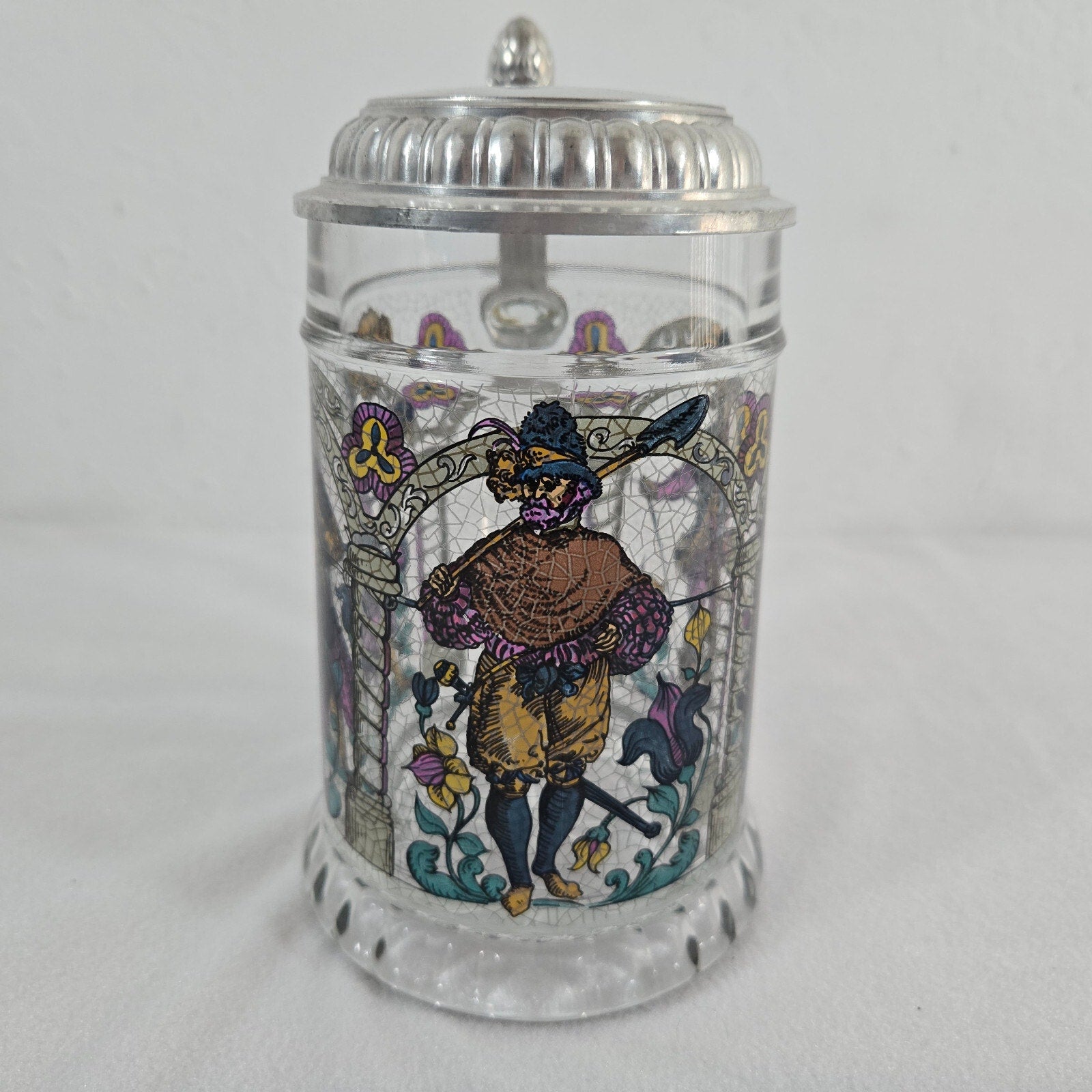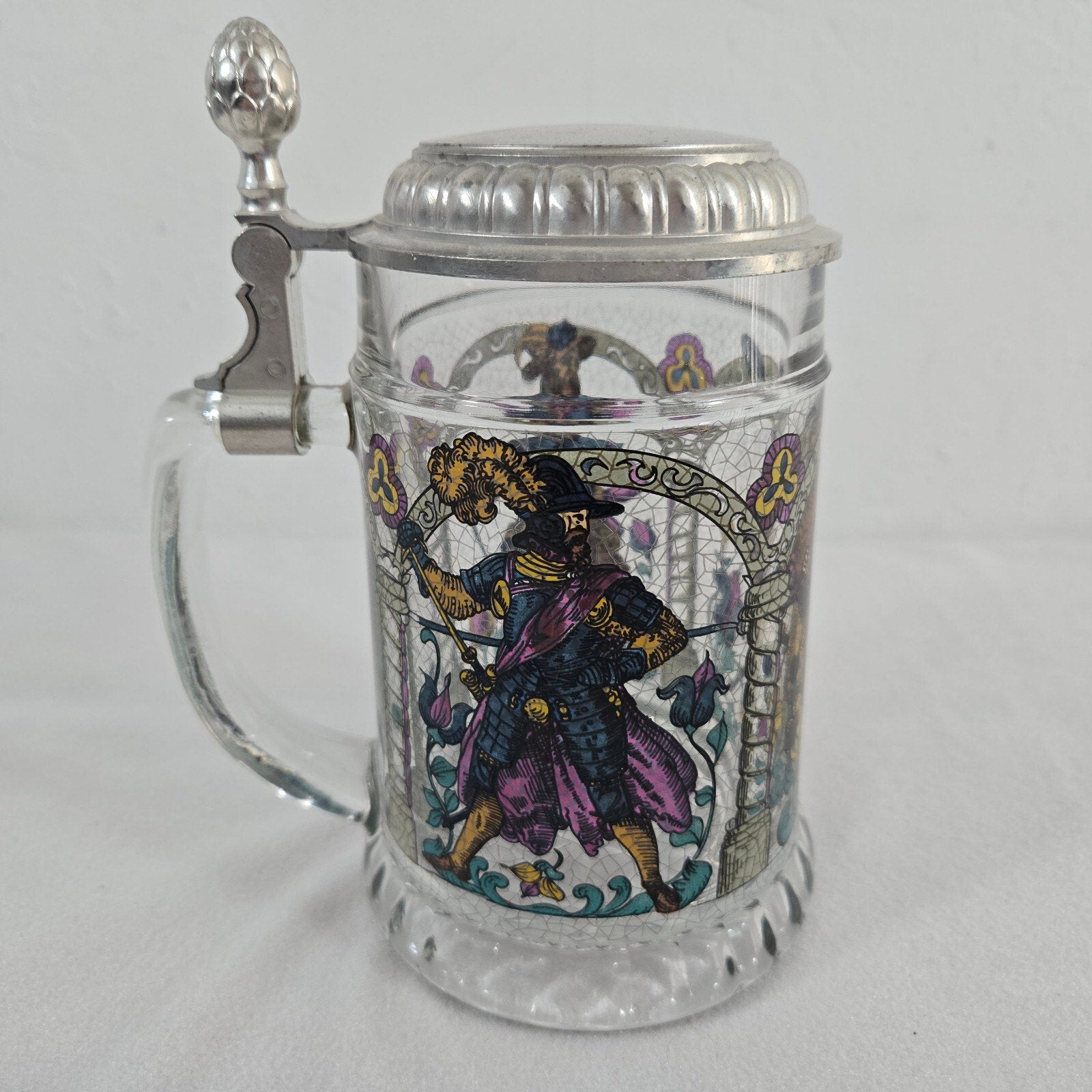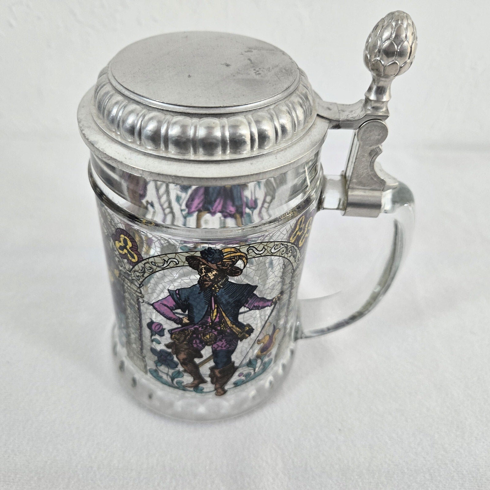 BMFN Three Musketeers Painted Glass Pewter Lidded Beer Stein 7" W. Germany