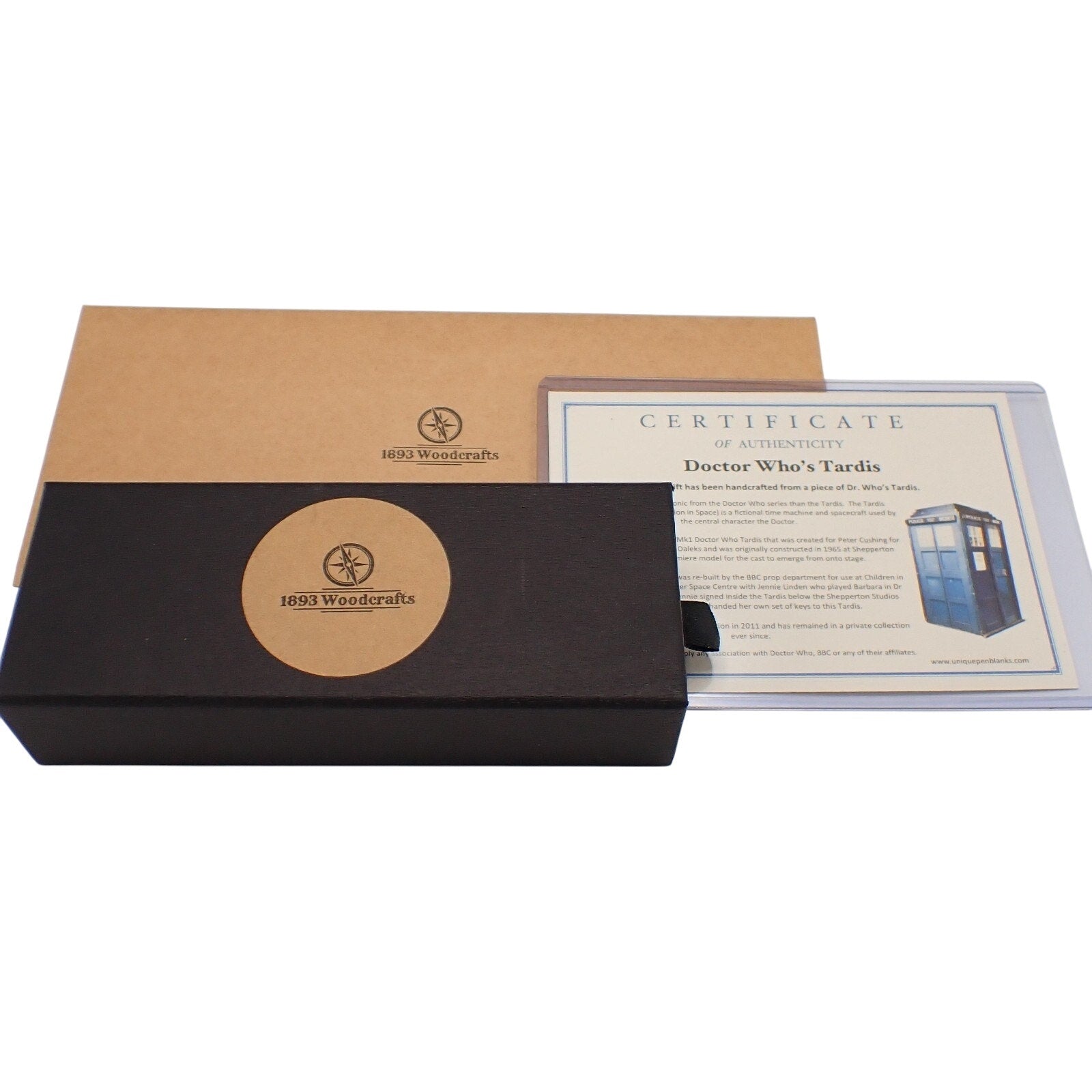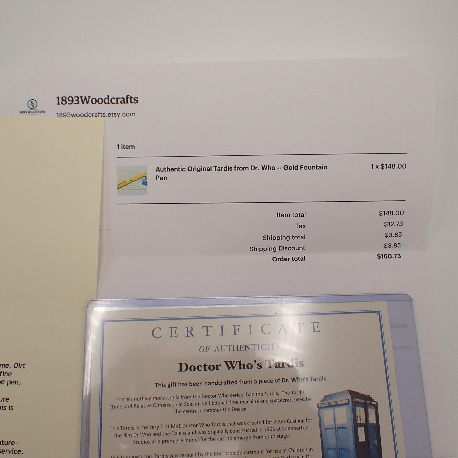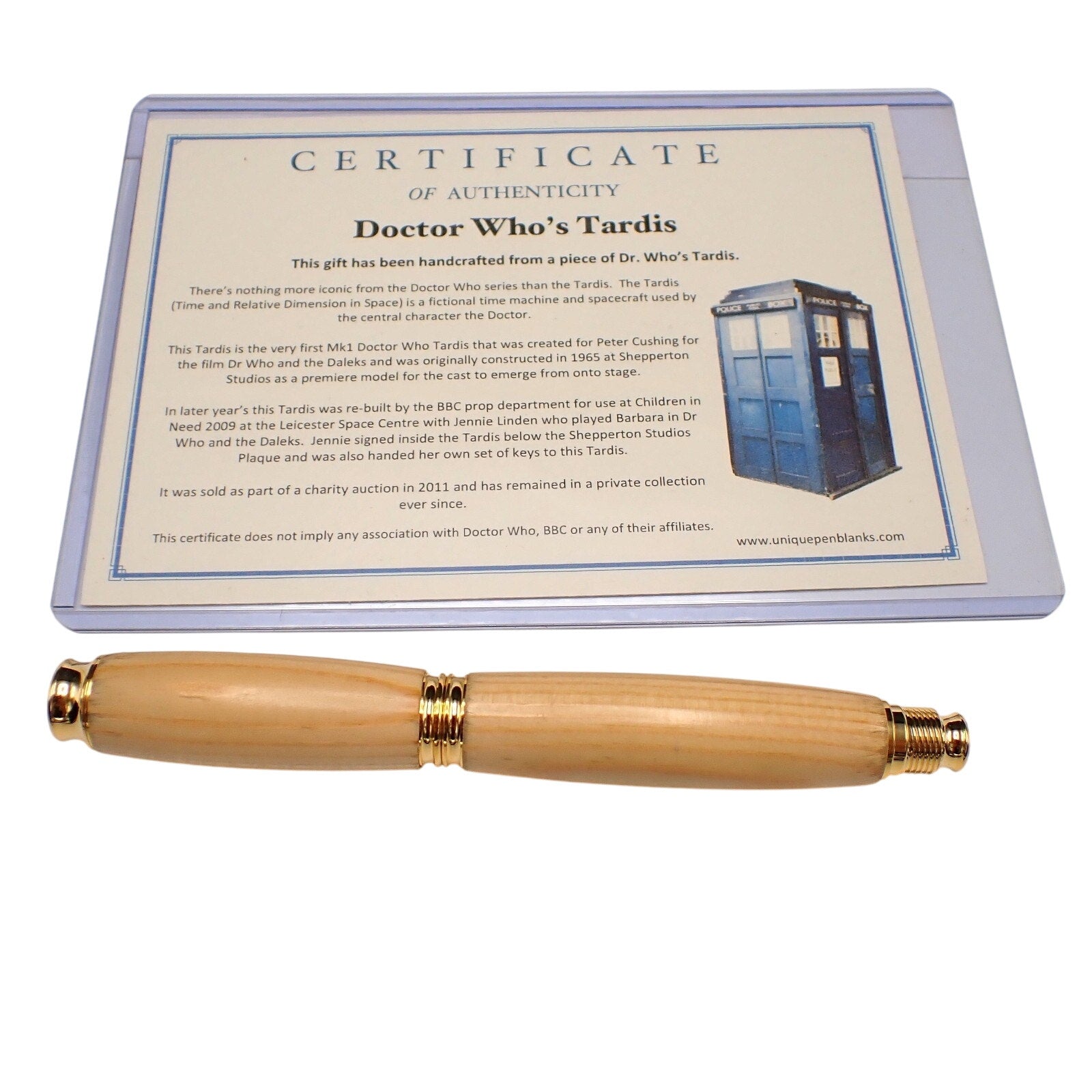 Tardis pen,Dr Who collectible,Gold fountain pen,COA included,1893Woodcrafts,Unique gift,UK memorabilia,Sci fi gift,Doctor Who fan,Limited edition pen,Handcrafted pen,British TV prop,Signed Tardis wood,Artisan pen,Gift box included