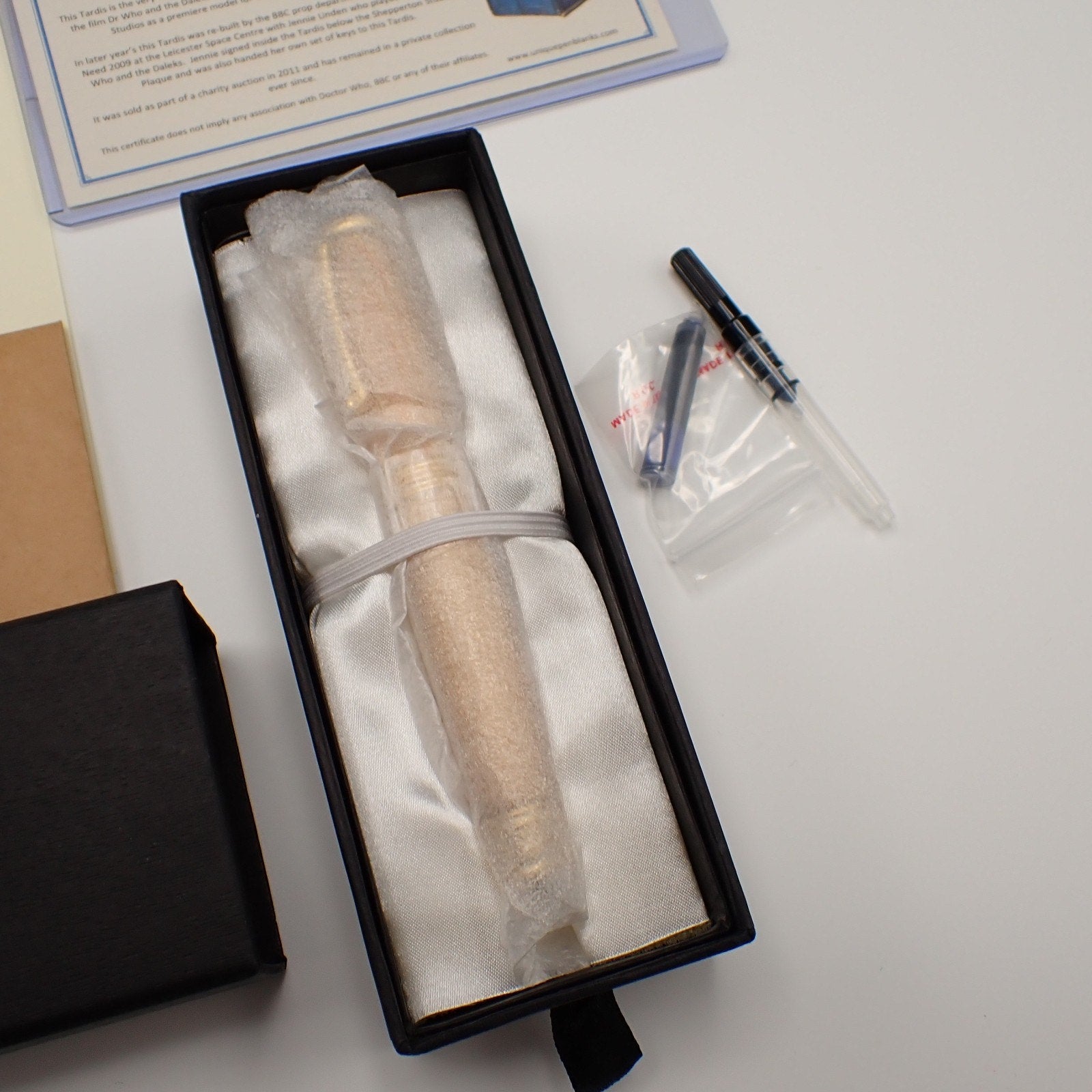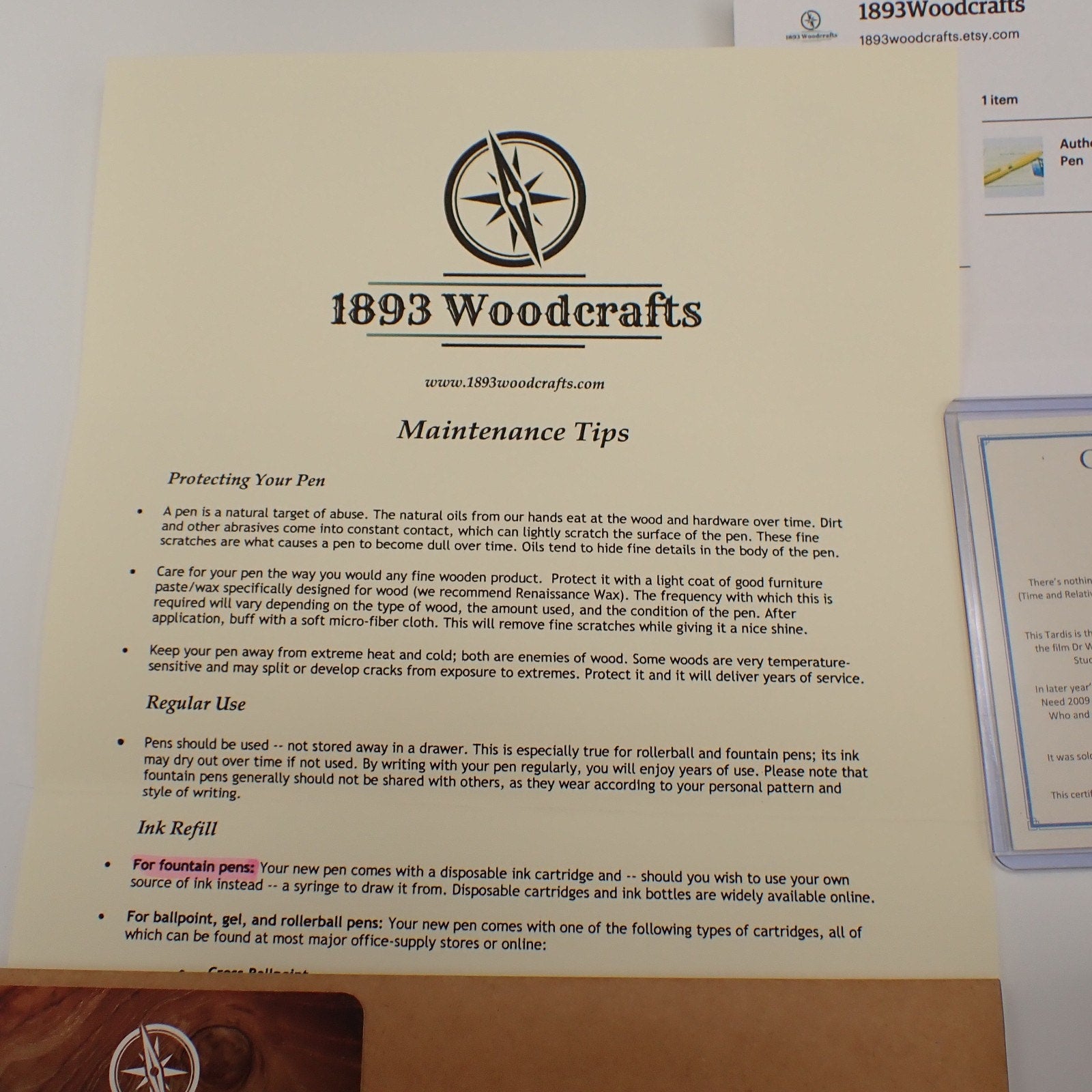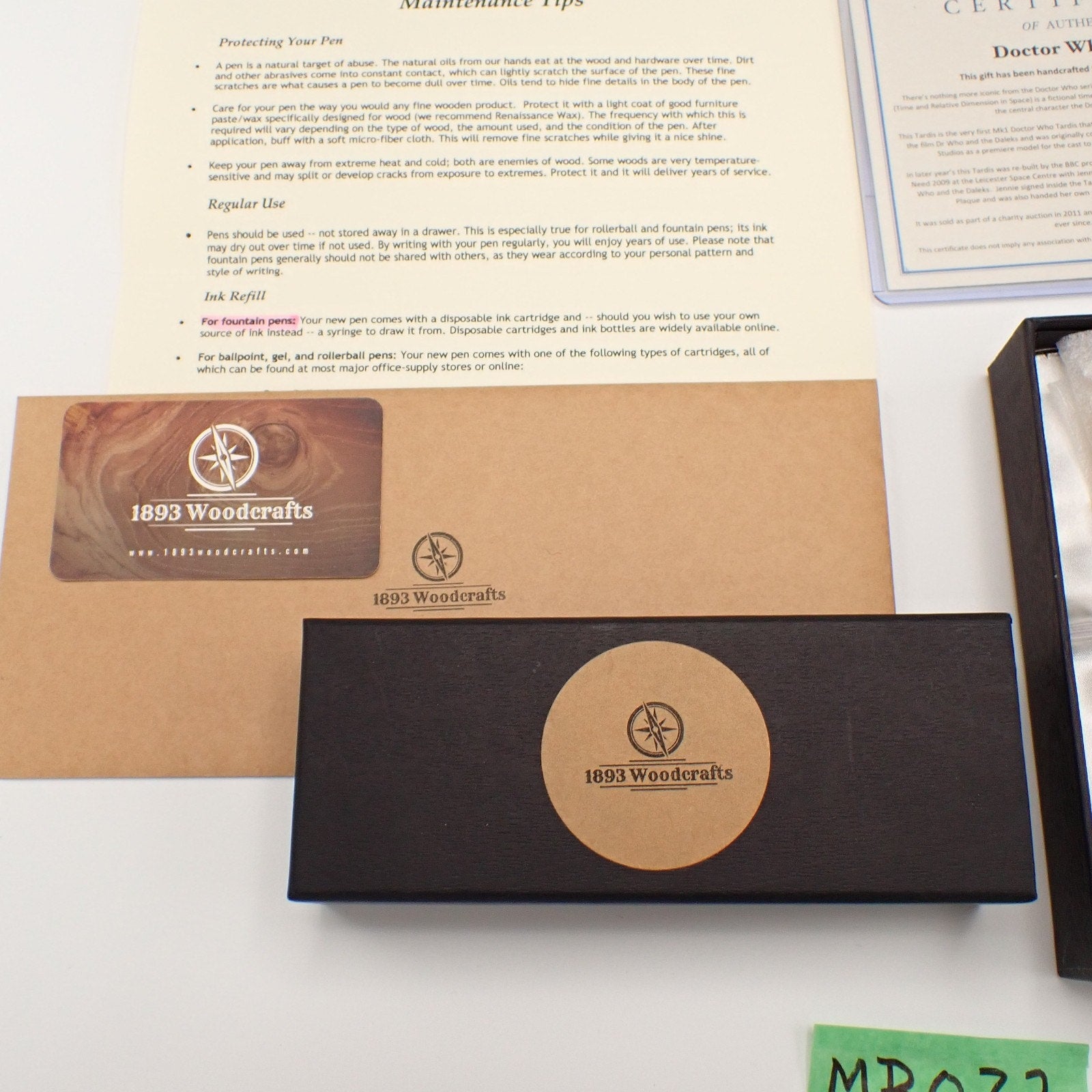 Presenting a stunning gold fountain pen handcrafted using authentic original Tardis wood salvaged from the iconic British TV series Doctor Who, accompanied by a Certificate of Authenticity. Crafted and designed exclusively by the artisan studio 1893Woodcrafts, this pen stands as a true collector’s item ideal for fans and fountain pen enthusiasts alike. The pen arrives in brand new, unused condition, guaranteeing flawless presentation for gift-giving or display. Featuring intricate detailing and premium materials, this unique writing instrument merges functional luxury with the spirit of science fiction memorabilia. Certificate authenticity assures the provenance of Tardis wood, and collectors can expect a truly one-of-a-kind piece, as each pen contains distinct wood grain patterns. Don’t miss the chance to own an exclusive collectible that bridges history, fantasy, and artistry.