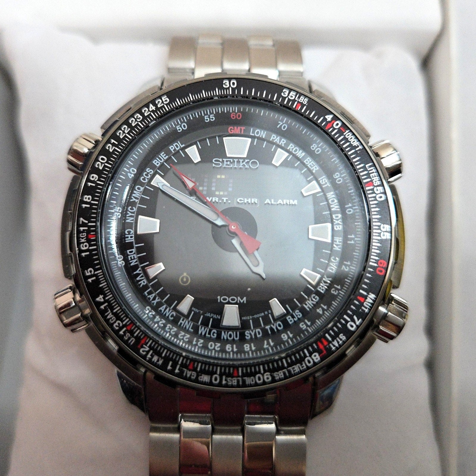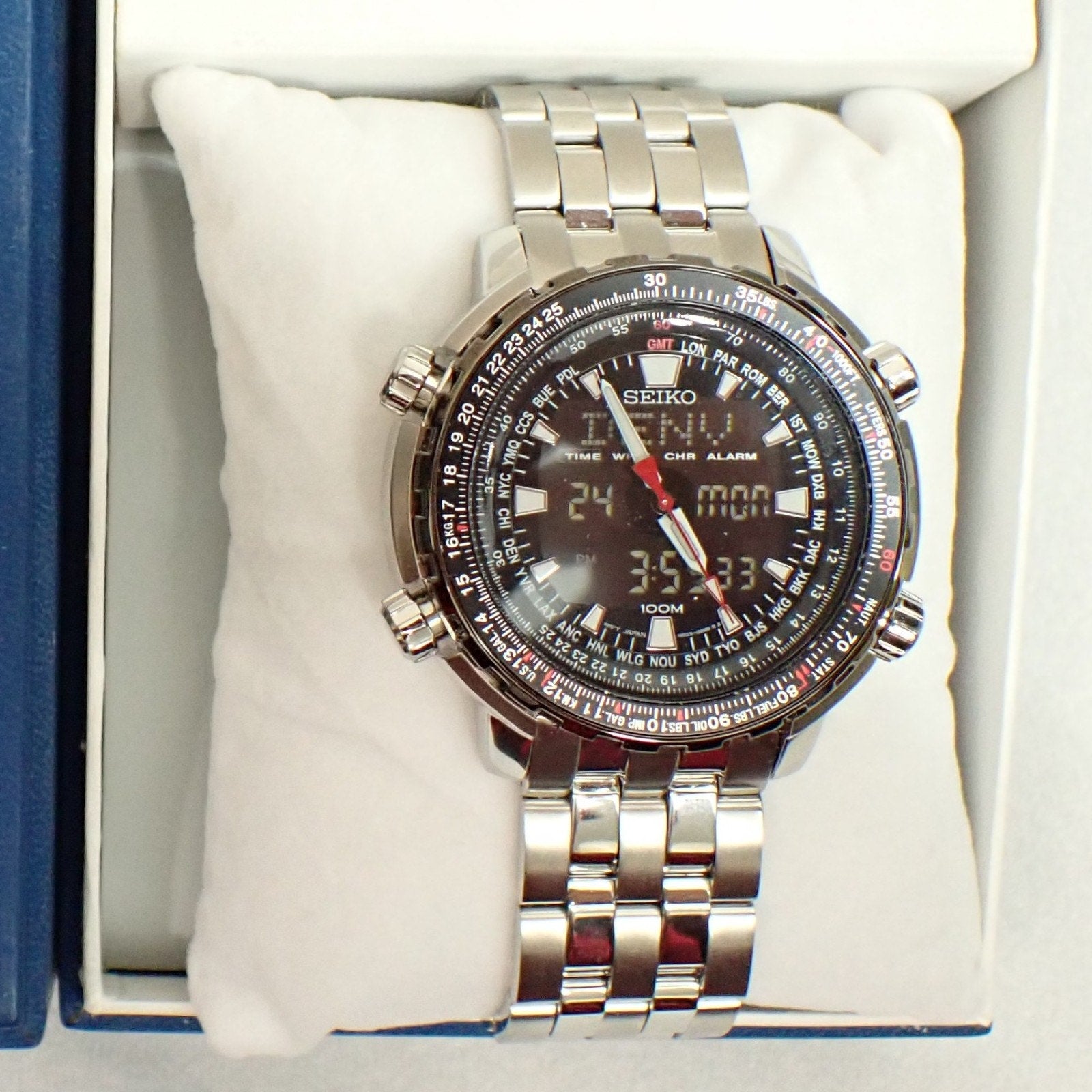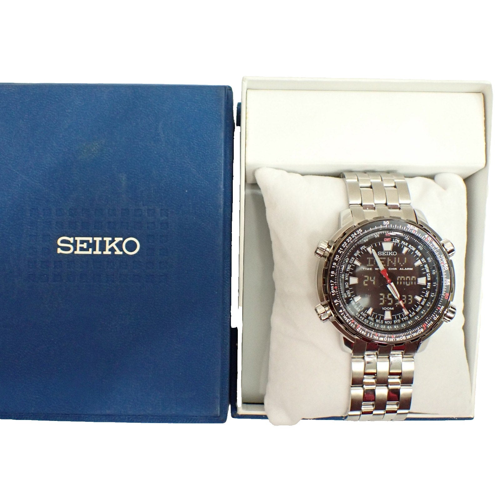Seiko, analog digital, duo display, H023, world time, quartz, alarm, chronograph, vintage watch, stainless steel, sportura, sky professional, boxed, Japanese watch, collector, NOS, 10BAR, water resistant, 2000s, multifunction